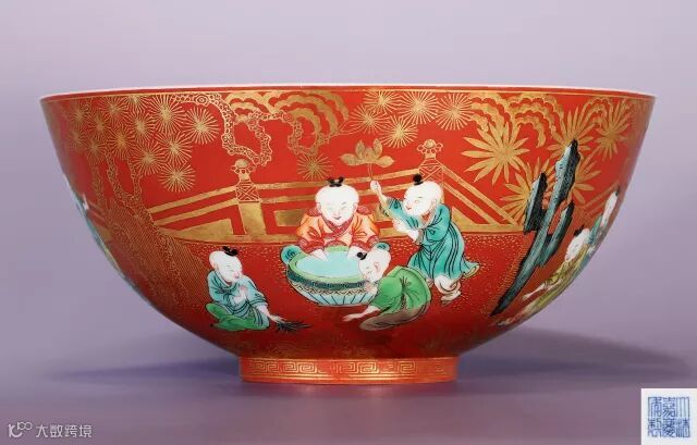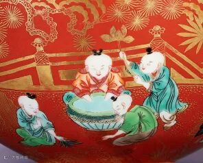 清嘉庆 珊瑚红地描金五彩婴戏图碗