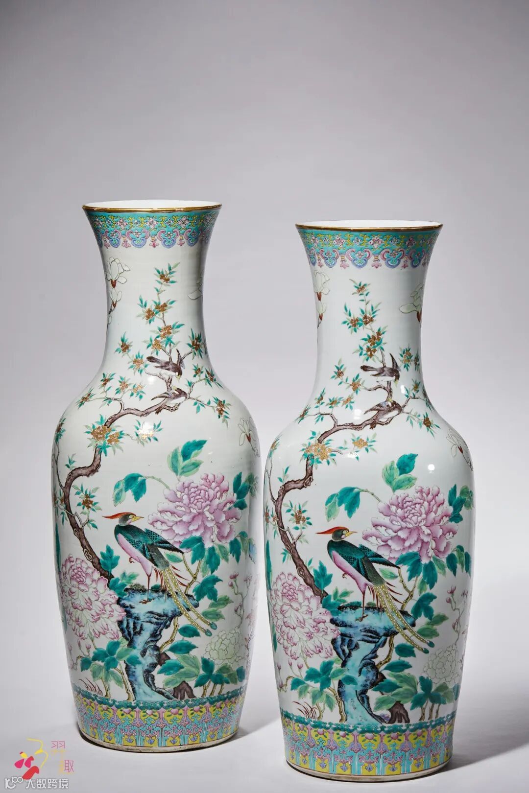 此对拍品形制秀美端庄,胎体细密坚实。通体施白釉,外壁以粉彩绘雉鸡牡丹纹饰,花团锦簇,鸟语花香,一派生机盎然之景。整器高端典雅,线条优美流畅,自然流露出洒脱高雅之感。纹饰代表着吉祥富贵,牡丹以它特有的富丽、华贵和丰茂,被视为繁荣昌盛、幸福和平的象征。雉鸡又称绶带鸟,是在寿图中经常选用的瑞禽,由于“绶”与“寿”、“带”与“代”谐音,因此绶带鸟便成了人们心目中长寿的象征。成对保存,陈设佳器。