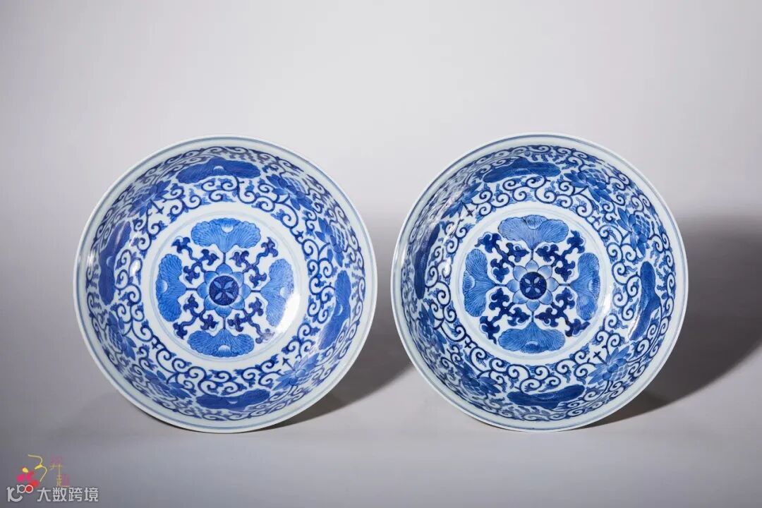 外粉彩云蝠内青花莲荷纹碗一对 款识:“大清光绪年制”六字双行楷书款 直径:17.5 cm.