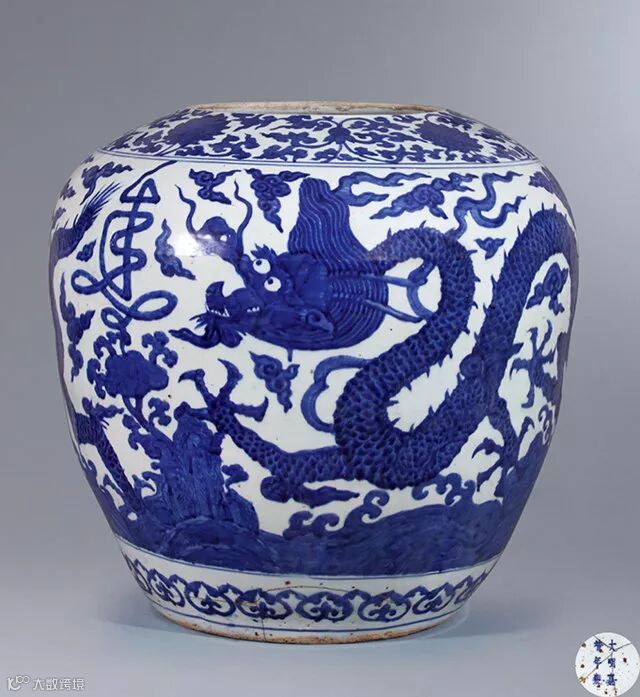 明嘉靖 青花海水龙纹大罐