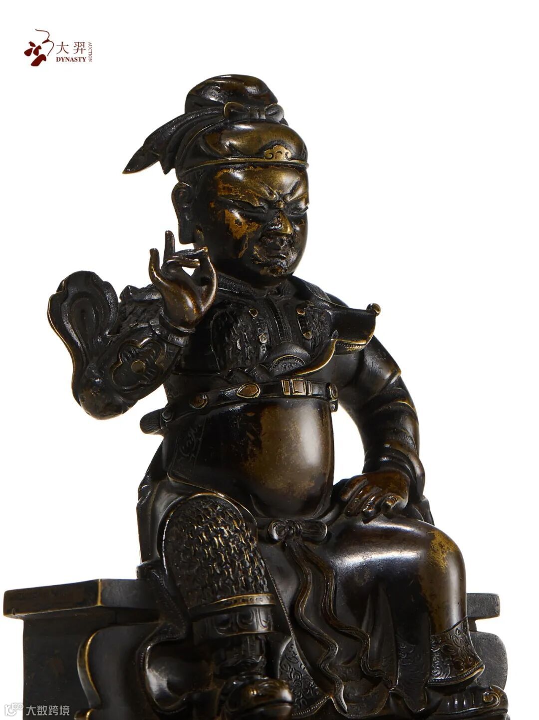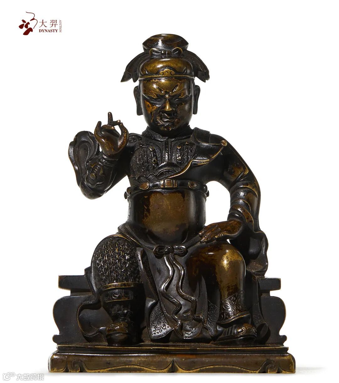 此像为乾隆宫廷造办处烧古工艺制作,烧古,中国古代仿造古玉器、古铜器的技术之一,又称烧色。其名称见于清内府养心殿造办处档案,约起源于宋代。造像头戴盔冠,面庞方阔,额际宽广,浓眉交蹙,凤目微合。身穿铠甲,足蹬云靴。衣饰、铠甲雕刻的精细入微,右手作捋美髯状,线条流畅,极具灵动之美!左手抚胯部,威风凛凛,气宇轩昂,端坐于长方台上。整尊造像铸造技艺高超,姿态生动有力,衣纹细腻流畅,细部雕刻纹饰一丝不苟。不论远观抑或是近取,皆能感受出其中流露之气派,成功地塑造出一位威严肃穆的智将形象。本尊造像铜质细腻,包浆醇厚,且造像底部封底完好,底板上刻画的十字金刚杵在漫长的岁月中牢牢守护着内部的装藏,使其的宗教灵性与加持法力得以保持,殊胜无比。路份极高的乾隆造办处风格,显示出了此像难能可贵的工艺水平。
