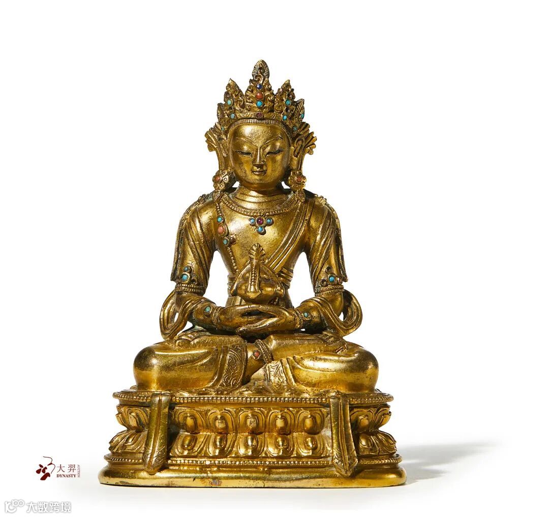 无量寿佛能满足现世人间众生对于寿命绵长的追求,亦能接引善良的众生死后超脱轮回之苦,故此一直是佛教信仰中广泛流传,此尊无量寿佛头戴宝冠,顶结高发髻,耳下垂精致圆环,面颊丰腴,额头饱满,长眉细目,嘴角微微上扬,相容和煦。双手交叠结禅定印于膝上,托长寿宝瓶,双腿结跏跌坐于双层束腰莲台之上。其中头冠、耳珰、璎珞等处皆镶嵌有宝石,极为精美、罕见。衣摆绸裙边缘皆錾刻有精致花纹,灵动的帛带缠于双臂,自然垂落于双层莲瓣座前,满圈的莲瓣肥厚饱满,洋溢着康熙宫廷造像特有的华丽雍容之气息。