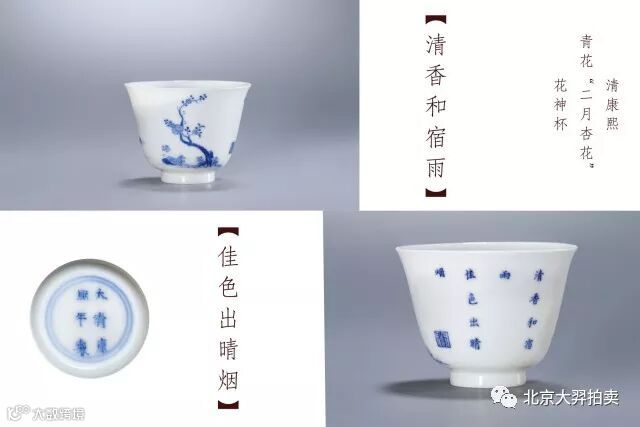 此杯微撇口,深腹,圈足,形如仰鐘,胎薄玲瓏,似乎脫胎。底青花雙圈內書“大清康熙年制”六字兩行楷書款。外壁繪二月代表的花卉——杏花,並綴以詩句“清香和宿雨,佳色出晴煙”及“賞”字,以詩書畫印合為壹,頗符合文人畫之意蘊內涵。