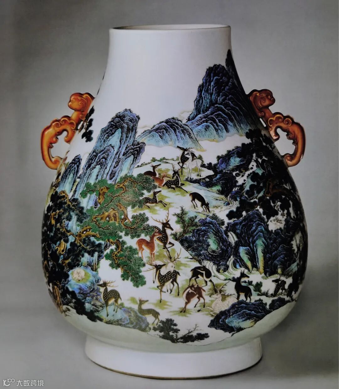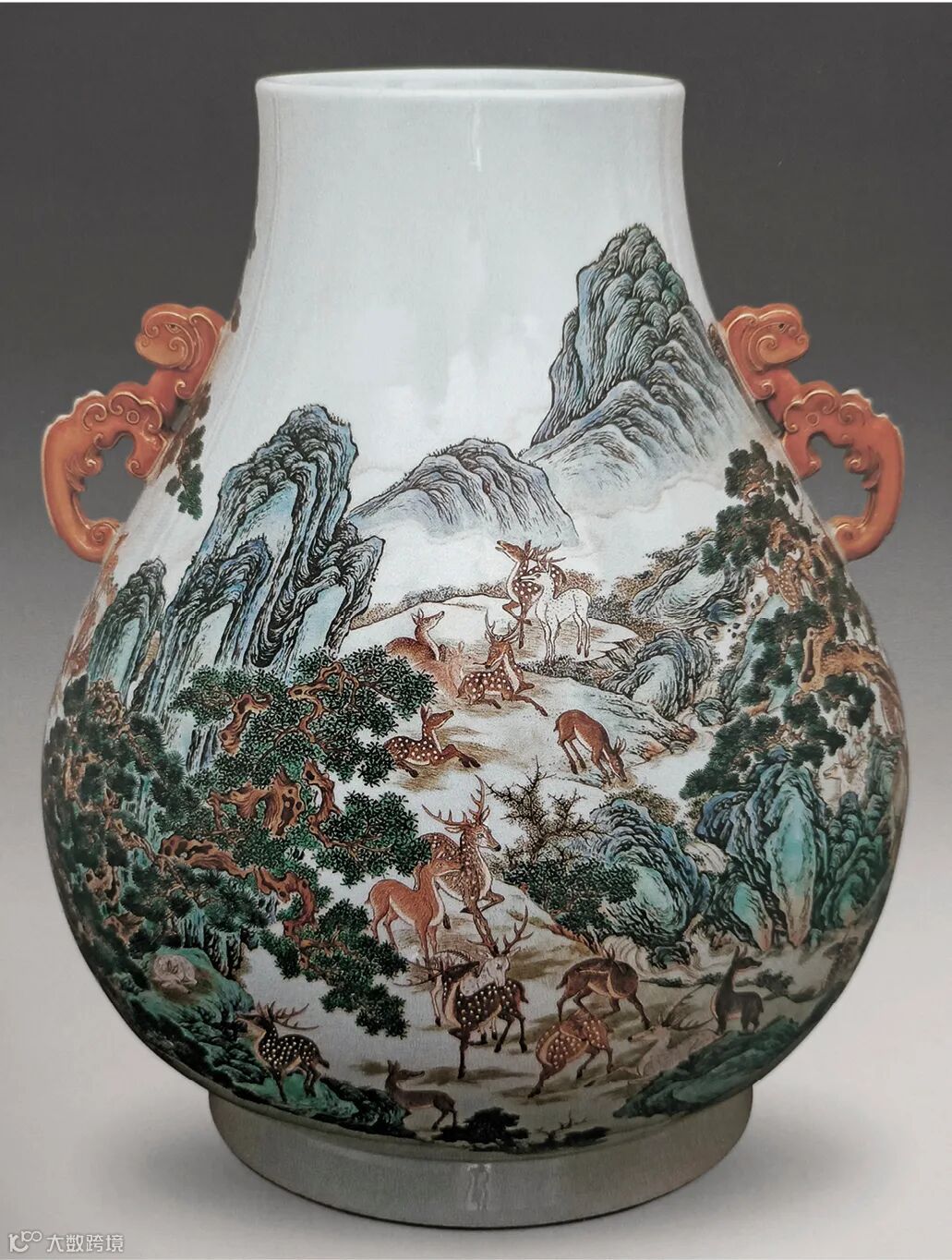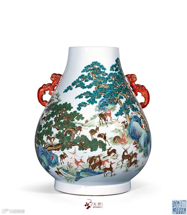 拍品敞口,口下渐广,垂腹,圈足。拍品造型沉稳庄重,胎质坚实细润,通体施白釉,施釉丰满,釉汁丰腴莹润,釉色微闪淡青。肩两侧对称饰矾红描金螭龙耳。器身以粉彩绘山水园苑百鹿图,但见隔岸地势起伏,植被繁茂,梅花鹿三五成群,或奔跑,或憩息,或相偎,姿态各异,但描绘简略,突出远景之比对。近景处则描绘详实,寿石相迭,有嶙峋峥嵘之貌,其侧两株苍松相依傍,枝干遒劲,松盖如伞,夹岸处有溪流跌宕而下,松荫之下几只梅花鹿徜徉其间,与常见百鹿尊鹿纹描绘较为简略不同,本品之鹿纹颇具西洋画法,鹿毛的质感通过明暗之对比,色彩的交错得以精细的表现,百态悉备,生动而传神,而山石苍松之画法则更多的遵循中国传统山水画之笔意,二者交融于此方天地,可谓中西合璧之佳器。鹿与“禄”谐音,百鹿即“百禄”,取高官厚禄意。故此器又名“百禄”尊。鹿为瑞兽,与瑞草灵芝、桃、松桐象征长生不老、松鹤延年之意愿。此尊画面表现了清皇朝重要的狩猎活动木兰秋狝。木兰为满语,意为“哨鹿”,秋狝指秋天打猎。这是自康熙二十二年起几乎每年秋天都举办的大典,这并非为了狩猎娱乐,而是具有重大的政治、军事意义。康熙皇帝为锻炼军队,在承德以北开辟狩猎场,每年秋季狩猎时用八旗兵头戴鹿头,在树林里口学鹿啼叫,引诱异性,鹿出之则合围猎杀。乾隆皇帝对此祖制甚为重视,还命宫廷画师把实况记录下来,景德镇工匠就照着这些画卷,把此重要的活动重现于百鹿尊,也是帝王铭德之器。无耳百鹿尊,现仅知一例,该例现藏东京静嘉堂文库美术馆。百鹿尊更多缀以矾红彩耳,本品即为一例。上海博物馆收藏一例,器形纹饰相近,载于《中国陶瓷全集》,卷 15,图版 17。清宫旧藏另见一尊,现藏于北京故宫博物院,录于《故宫博物院藏文物珍品大系·珐琅彩、粉彩》,图版85。