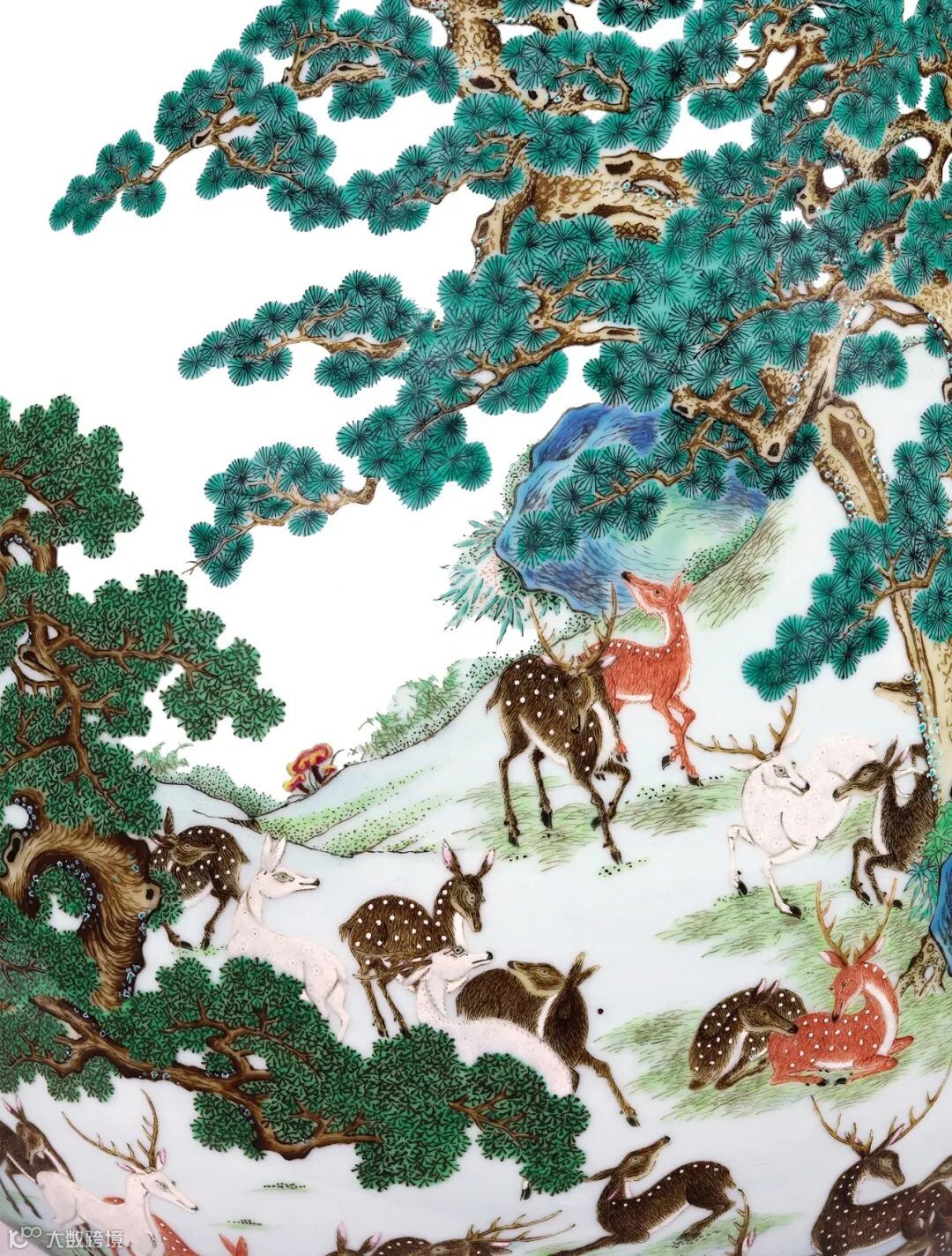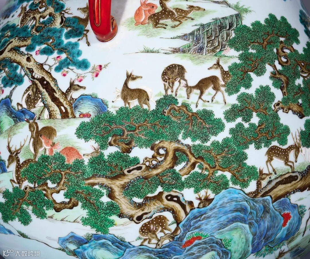 细观此尊上的群鹿,鹿毛的质感通过明暗对比,色彩参差得以表现,百态悉备,生动传神,应为西洋绘画的技巧,而山石的画法则遵循中国传统山水皴法绘画的笔意,这与乾隆时期清宫院画特征相符。由此也证实了此纹样应是以当时宫廷画家所绘样稿为原型,经观察对比,波西米亚传教士画家艾启蒙所绘的“百鹿图”,无论从构图以及中西合璧的绘画技法,都与此尊上的群鹿图十分契合。