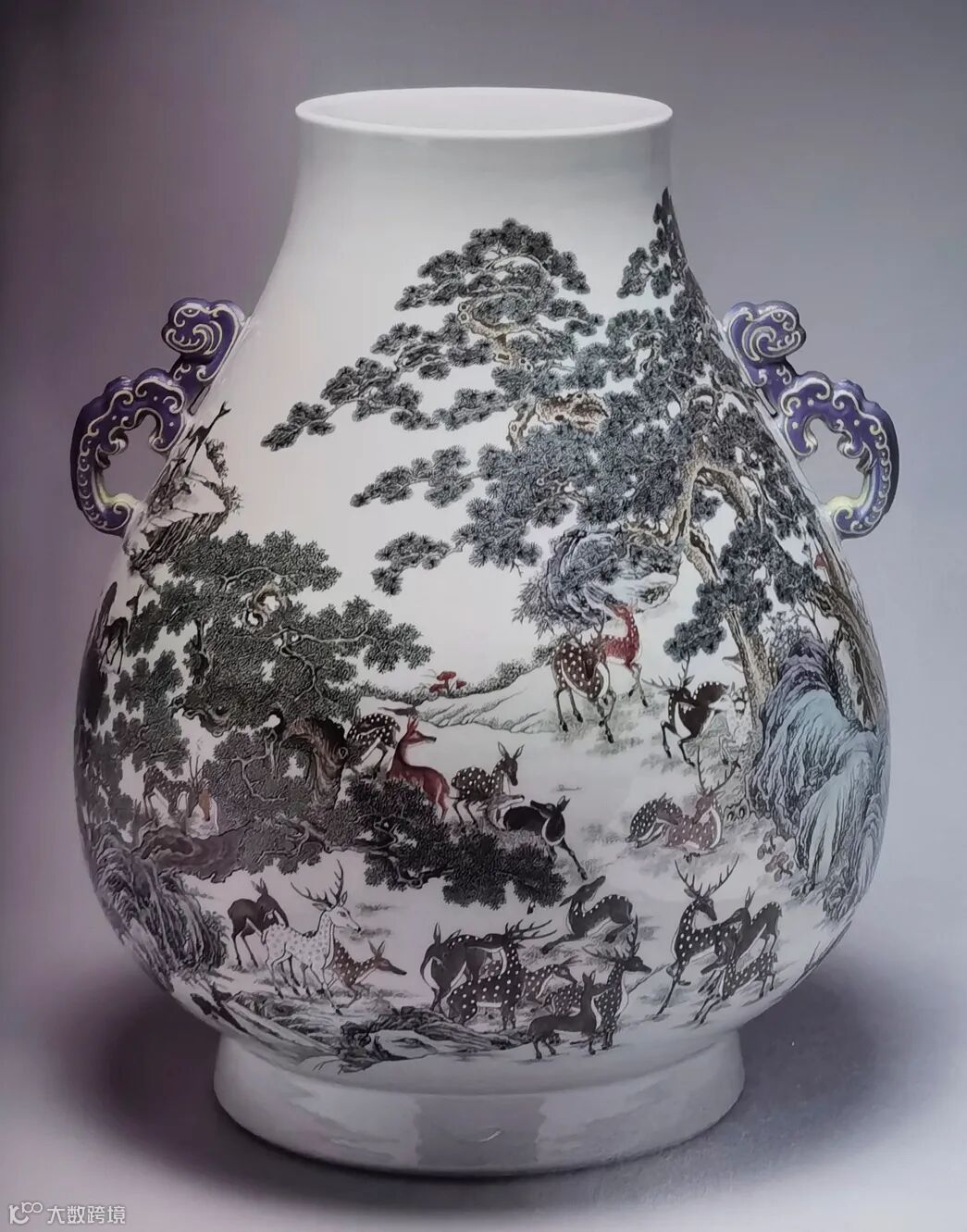 而百鹿尊这件瓷器却将“福禄寿喜”之类吉祥符号,完美地集于一身,不但是皇家尊贵地位的显示,也充分体现了乾隆官窑精品的时代风貌和技法水平。百鹿尊不但造型独特,描绘亦十分精细。纹饰虽繁缛,布局却疏密有秩。更令人称道的是,其装饰效果虽华丽富贵,却又雍容典雅清新不俗,不愧“千古第一瓷”之誉。据说,乾隆六十寿诞时,群臣祝寿,乾隆谕旨三品以上的官员才有资格进宫拜请百鹿尊。