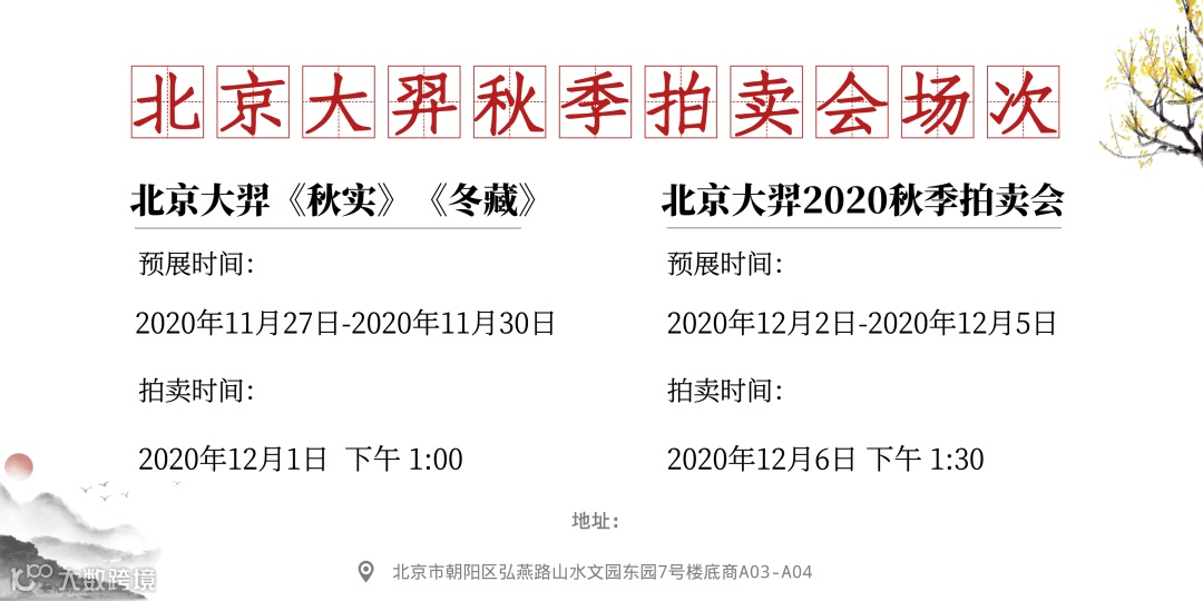 日子,就像念珠一样,一天接着一天滑过,串成周,串成月,串成年……不经意间,已经到2020年11月。距离2021年还不到2个月的时间,好像还有很多事没有完成。为了让2020年不留遗憾,北京大羿将在12月初隆重启幕北京大羿2020年秋季拍卖会,激情四射的落槌声,以及与艺术相伴的恒久美好,将在这里开始……