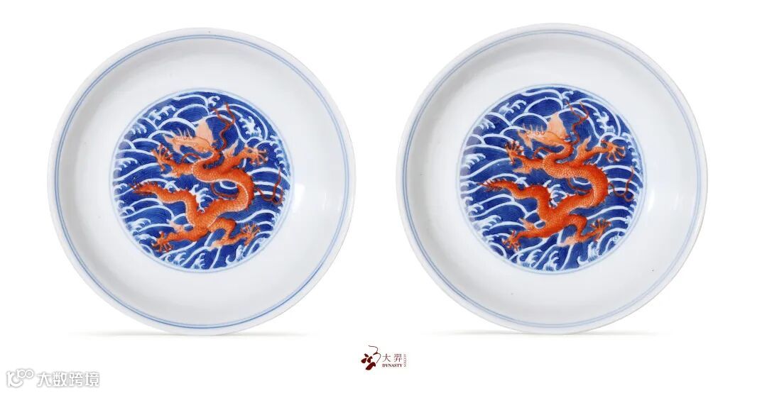 青花海水矾红龙纹盘