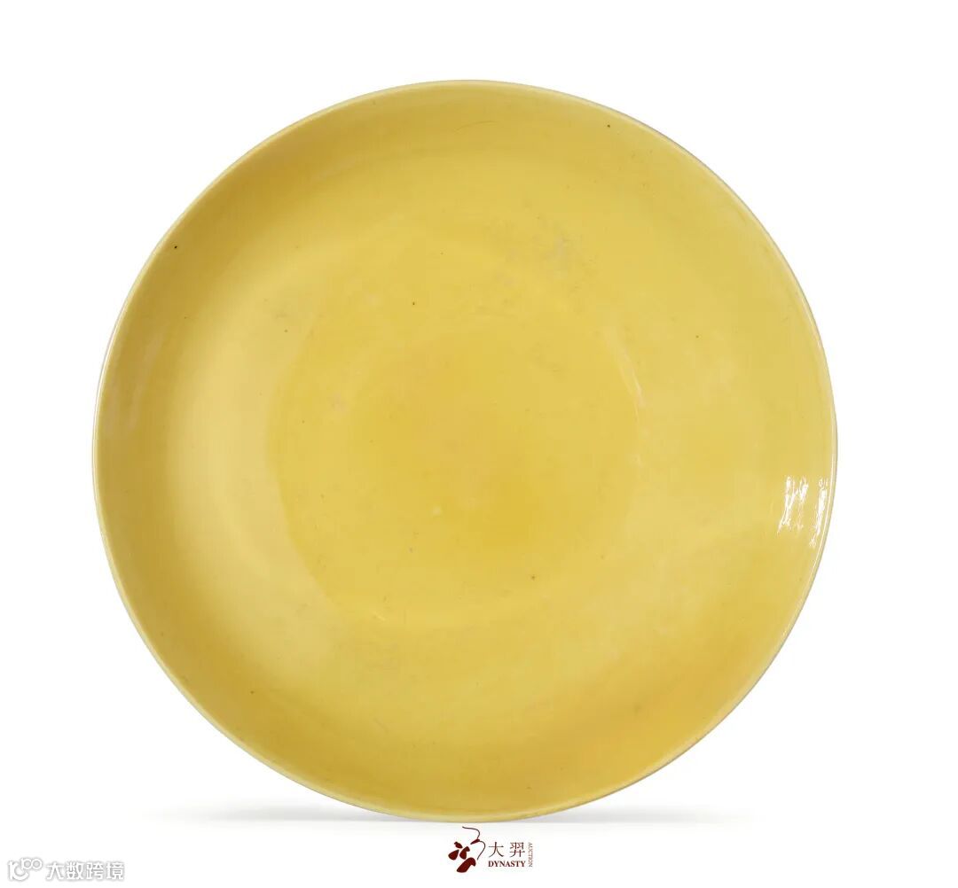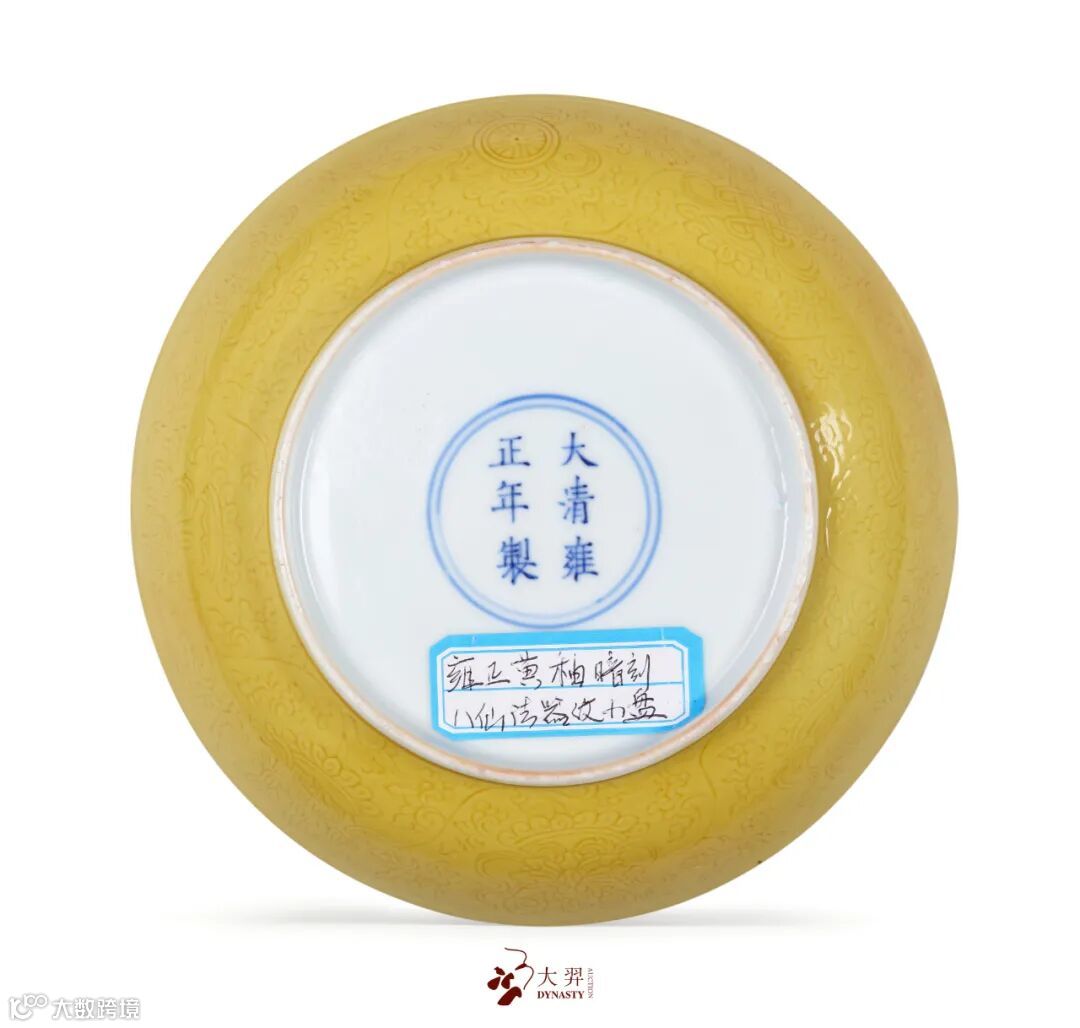 此盘撇口,弧腹,圈足,造型规整大方。通体施黄釉,釉面匀亮光洁,盘外壁釉下通景暗刻莲托八宝纹,纹饰刻划精美,刀法流畅细腻。底书“大清雍正年製”六字双行楷书款。