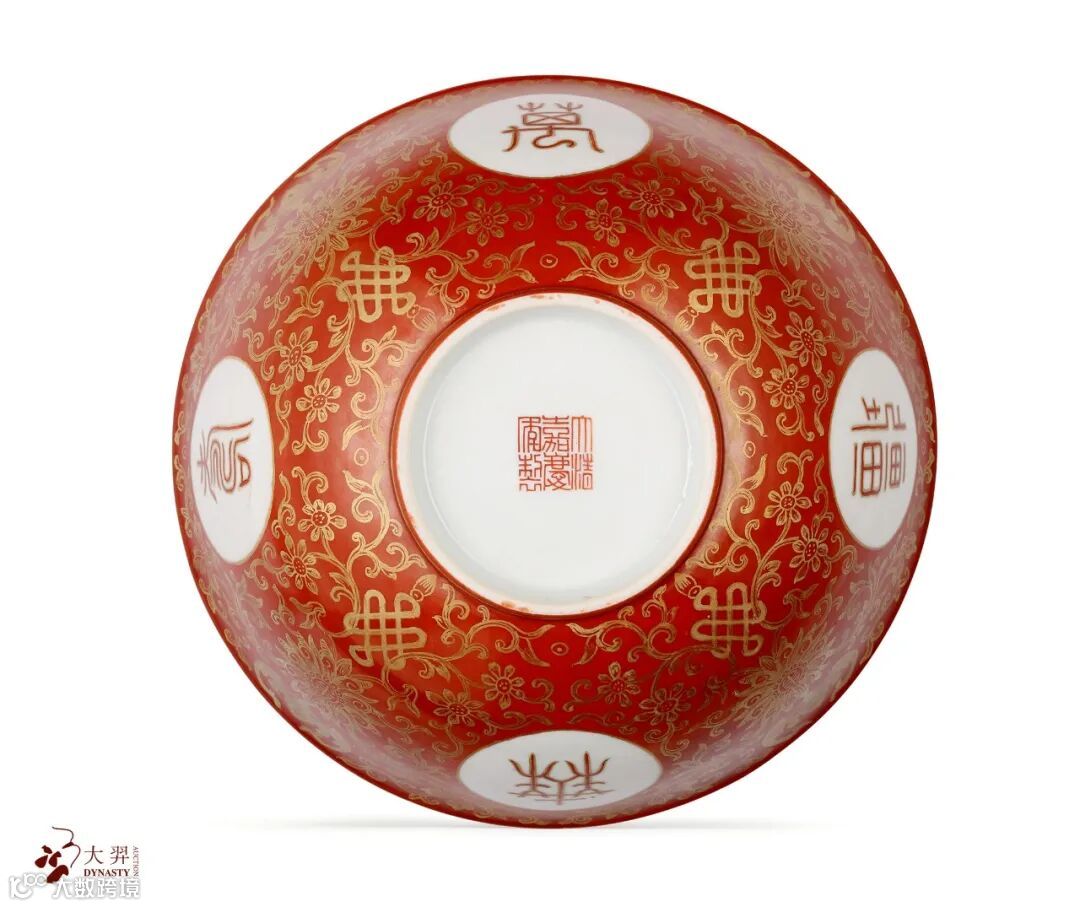 LOT17 清嘉庆 珊瑚红地描金花卉开光万寿无疆纹盖碗(底部图)