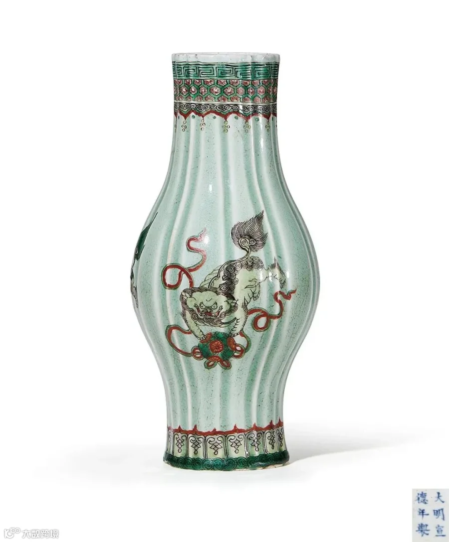 拍品直口,直颈,鼓腹,圈足,形似橄榄,故称“橄榄瓶”。口沿一周回纹,其下作龟背锦纹一周,再下如意云头纹一周,再下环饰璎珞纹,腹部绘狮子滚绣球纹饰,狮子憨态可掬,气氛热闹喜庆,墨彩勾勒,绿彩及红彩晕染,给人以清新悦目、幽雅脱俗之感。