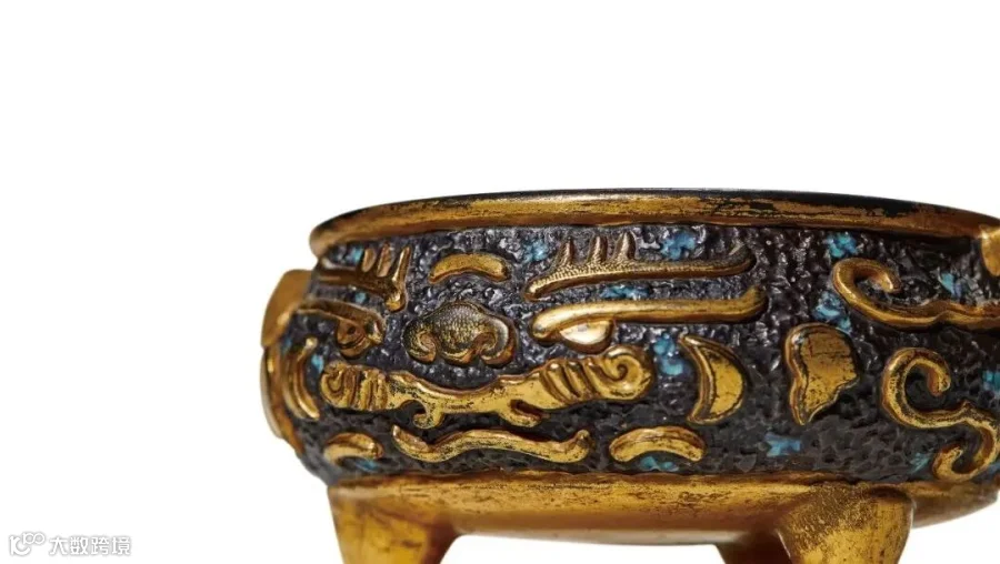 拍品器身矮扁,圆唇口,鼓腹,三足。腹身雕兽面纹,诡谲恣蔓,奇肆迭宕,尤臻庄穆肃严之境,状貌甚觉威严挺拔。整器形制端稳,施古铜彩,釉色与造型相符,增加了造型的美感和欣赏性, 于图案处施金彩,与黑色底釉反衬,金光灿烂。
