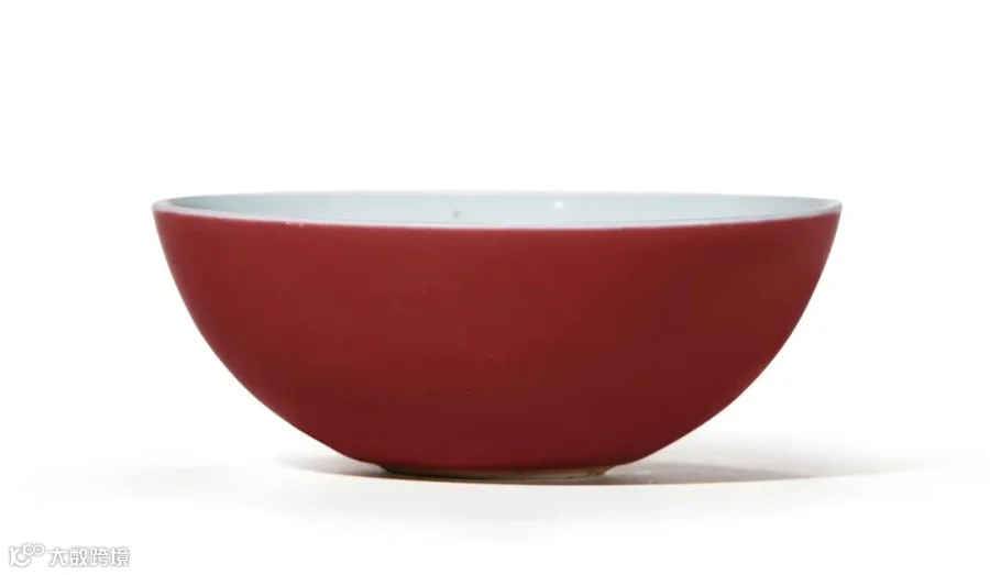 拍品卧足,线条流畅秀美,胎质细腻。外壁满施霁红釉,釉色纯正浓艳,釉面微现桔皮现象,具有雍正时期典型特征。卧足之形,盛兴于永乐、宣德二朝,造型创作源于古波斯簪花银制卧足碗,为雍正朝御瓷之独有式样,属碗中最为尊贵的碗形之一。