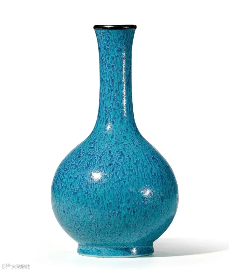 拍品长颈,球形鼓腹,球形腹至下渐收,圈足。颈部轮廓秀美,腹部浑圆,器型严谨。通体施炉钧釉,釉面莹润光亮,釉水流淌自然,釉色古朴雅致,如云如霓,翎羽光灿,如水如波,春茵繁茂。传世的清代炉钧釉以小件居多,像这样的天球大器则较为难得,且造型规整挺秀,稳重古雅,更见珍贵。