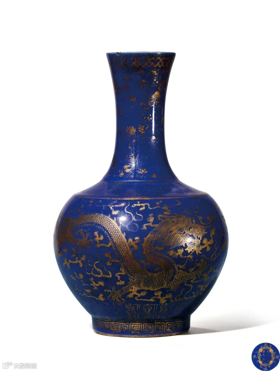 玉堂春瓶是清宫经典的陈设器皿,光绪朝之前,赏瓶以青花绘制缠枝花卉品种最为多见,自光绪朝始,赏瓶种类日渐丰富,除青花外,还出现了粉彩和霁蓝、洒蓝等品种,此件作品是光绪朝官窑瓷器中极具代表性的品种,瓶敞口,长颈微束,鼓腹,圈足,浓艳的霁蓝釉上加描金装饰,器身以云龙为饰。此器浓妍深沉,其金彩璀璨夺目,霁蓝庄重静穆,交错相映,华丽堂皇,尽显祥瑞吉庆。