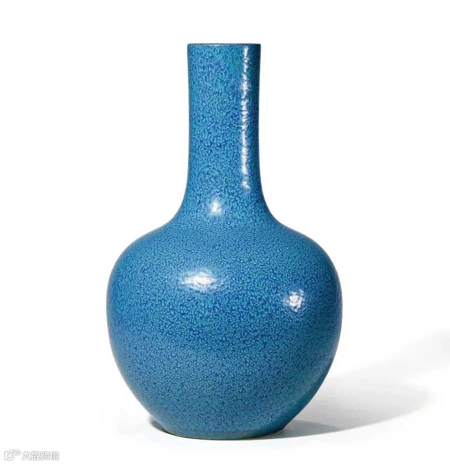 炉钧釉为雍正御窑仿钧釉时所创,盛行于雍干二朝。为单色釉之名贵品种,因其于低温炉内烧成仿宋钧釉而得其名。《陶成记事碑》记载炉钧釉主要作为御品,以贡内廷;又描述其“色在广东窑与宜兴挂釉之间,而花纹流淌过之”可知其釉色为仿钧窑杂糅以宜兴挂釉之法,自成别致。传统炉钧釉器有红炉钧和蓝炉钧之分,本品即为蓝炉钧。蓝炉钧是以含钴色釉烧制成的自然流淌成各色条纹和垂流状斑片,再以锡盐使釉色失透,整个釉色泛出蓝色。