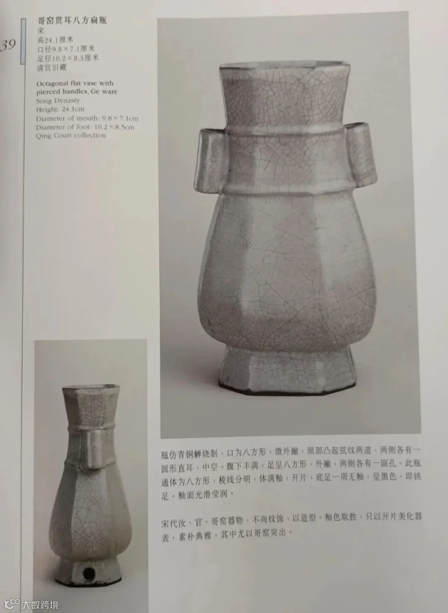 据《清档》记载,雍正帝屡次命郎中海望持内宫所藏宋代瓷器原器交于唐英对照仿制。我们有幸在《故宫藏文物珍品大系·两宋瓷器(下)》中发现,第39号之“宋哥窑贯耳八方扁瓶”即为此雍正八方贯耳瓶的母体。原宋哥八方瓶为“清宫旧藏”,高24厘米;造型、高度与此雍正器庶几相似,惟雍正器为汝釉鱼子纹开片,且器型比宋器略显周正。或为唐英按同一宋代原器施以不同釉色之品。而雍正瓶穿带孔为方,宋代原器为圆孔,想来或以方圆区别时代。