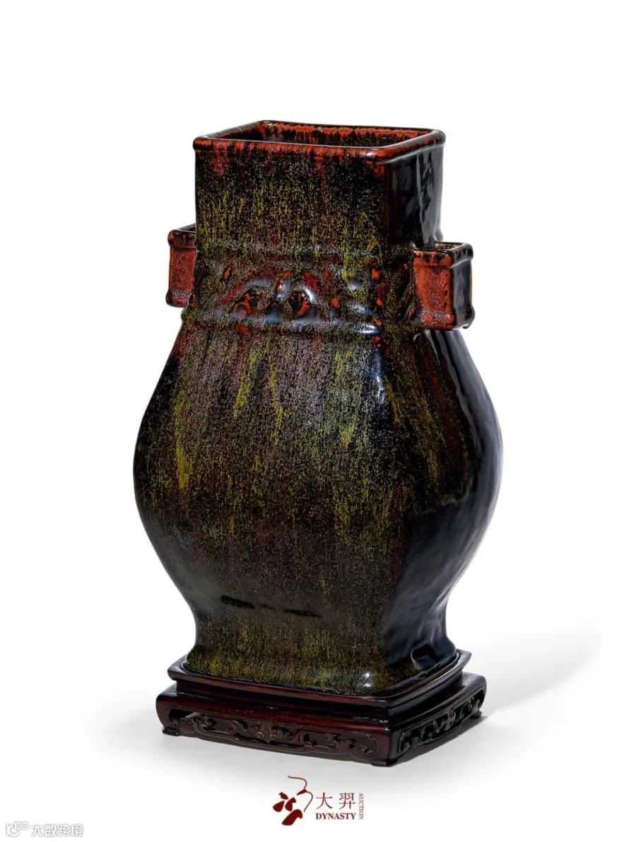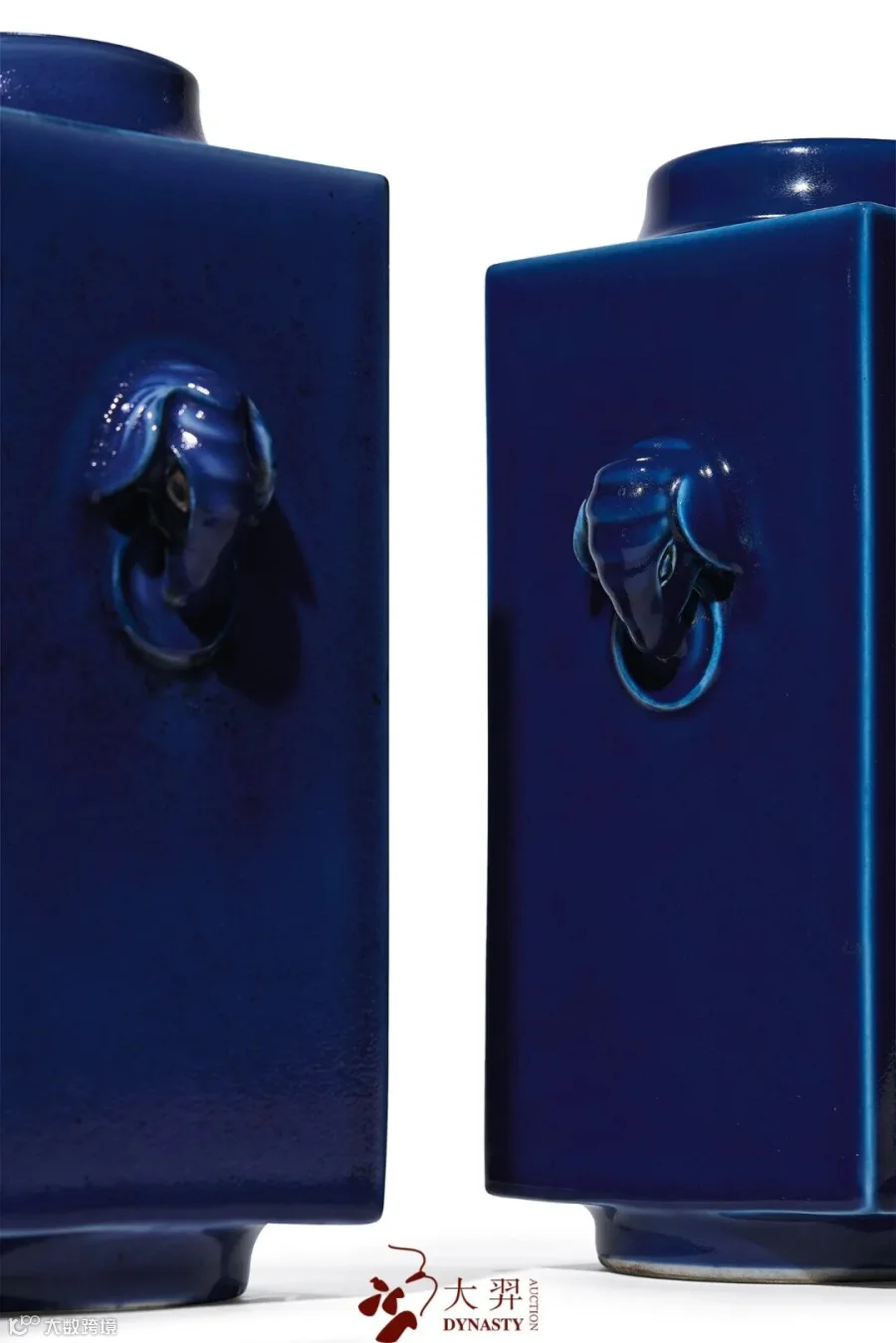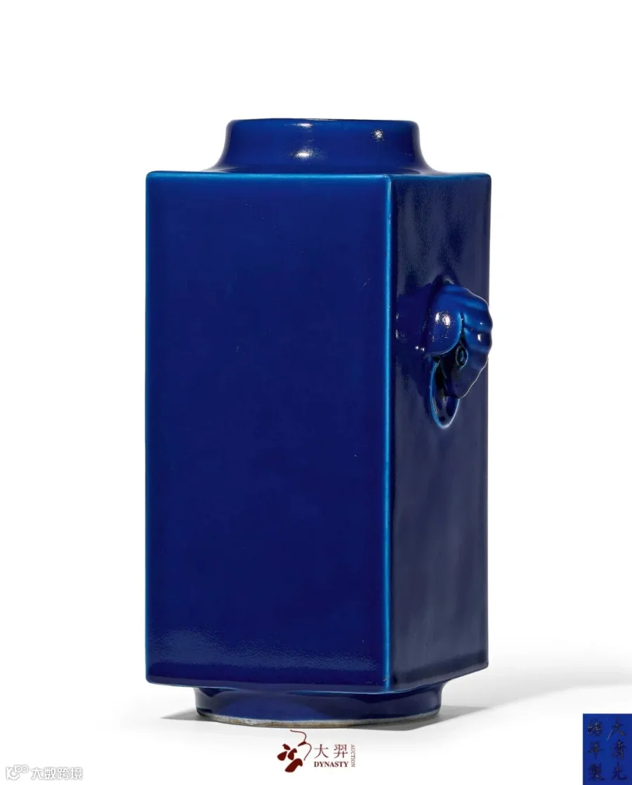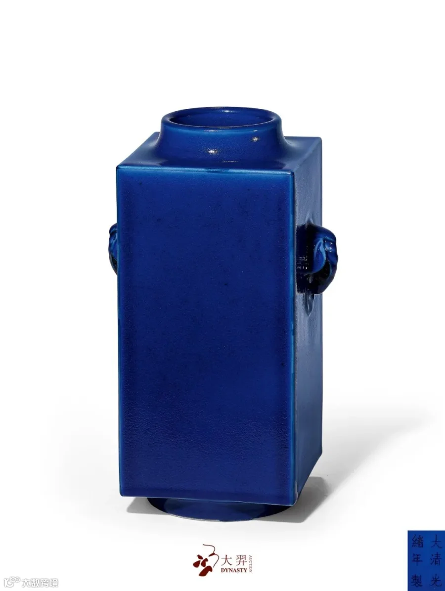 拍品造型仿玉琮,外方内圆,两侧饰象耳衔环,下承圈足。通体施霁蓝釉。底书“大清光绪年制”六字双行楷书款。瓶身造型周正,霁蓝釉发色沉稳,釉质凝厚,为光绪官窑精品。