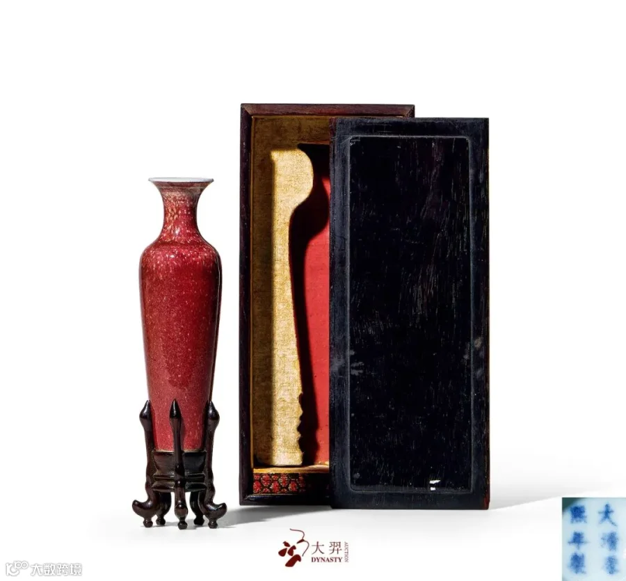 豇豆红釉为康熙年间仿明宣德的铜红釉品种,色如豇豆皮,故得名。其色调淡雅,“红似朝霞欲上时”。初期因烧制难度很大,故而仅限有文房小件器物为主,后世多有仿烧,本品即为其中佳例,造型纤细似柳叶,故有“柳叶瓶”之称,又因隽巧秀美宛如亭亭玉立之佳人,又称之为“美人肩”。器底挖足甚深,施白釉,内青花书“大清康熙年制”六字楷书款,通体罩施豇豆红釉,淡雅的红色中掺杂淡色斑点,甚为柔和悦目。