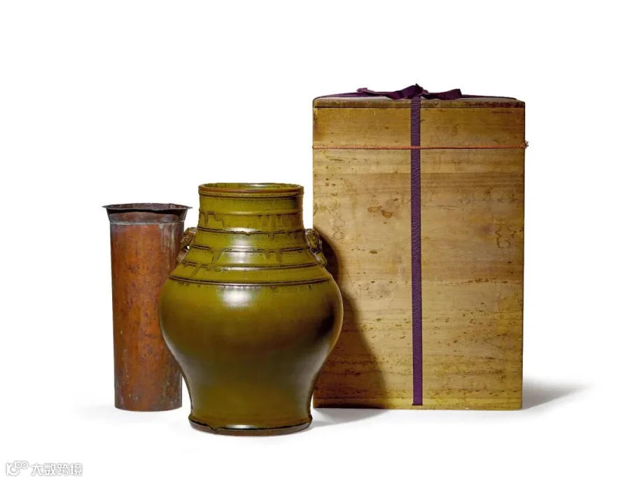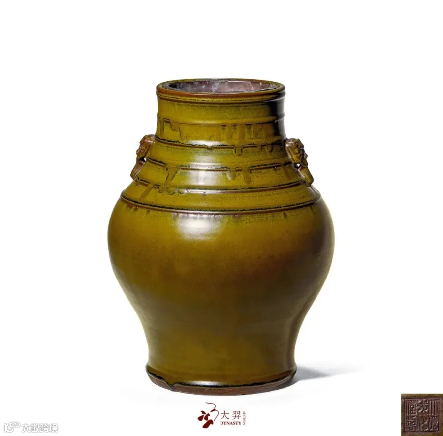 本品体量颇丰,口足相若,中部鼓腹,肩部对出双兽耳,颈部环饰六道弦纹,通体满施茶叶末釉,釉质肥润,色泽深邃古朴。茶叶末釉亦称厂官釉,系雍正朝督陶官唐英借鉴古代北方窑场产品烧制出的重要色釉之一,《陶成纪事碑》记载“仿厂官釉,有鳝鱼黄、蛇皮绿、黄斑点三种”。内压印“大明成化年制” 三列六字寄托款。