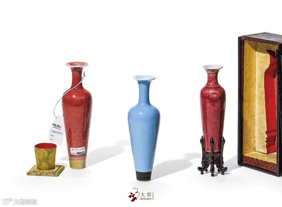 拍品撇口,长颈,削肩,自肩下至足渐收削。因其造型纤细似柳叶,故有“柳叶瓶”之称;又因器形秀美如亭亭玉立少女,又称之为“美人肩”。器底挖足甚深,青花楷书“大清康熙年制”六字双行楷书款。足外墙有一圈无釉色胎,这是“柳叶瓶”的工艺特色之一。瓷器口内,足底施白釉,其外通体天蓝釉,釉质细腻纯净,釉色谈雅柔和。天蓝釉是康熙朝创烧的高温釉品种,其釉中氧化钴的含量在百分之一下,在高温还原焰中烧成的釉色如天蓝般幽淡隽永,使人赏心悦目