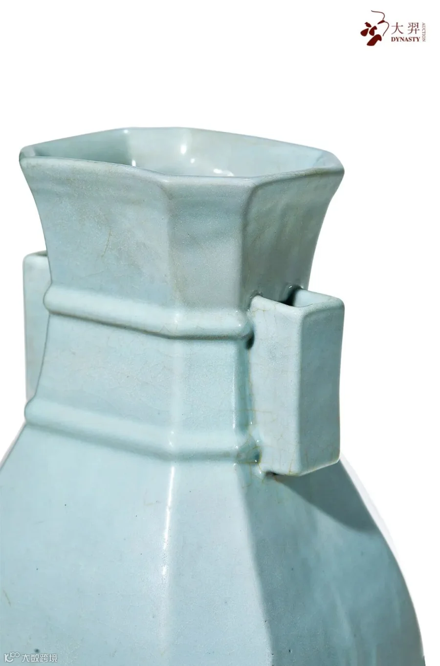 贯耳瓶造型来自青铜器,是一种由来已久的陈设用瓷,最迟在宋代的多个窑场中就有批量出产。清代贯耳瓶的造型变化更加丰富,或古朴端庄,或细致秀丽。而八方贯耳瓶器型则首创于雍正年间。本器即是雍正御窑根据宋代造型以及自身创新结合发展而来的产物,八道棱角自上而下贯通全器,两侧对置贯耳,造型恢弘,敦实挺拔,彰显出皇家庄严气度。