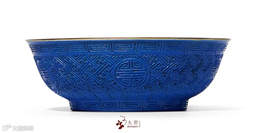 此类以瓷仿漆的新品种,除命景德镇御窑厂以瓷胎、彩釉仿制外,并以御制诗题赞。正如朱琰《陶说》赞曰:“戗金、镂银、琢石、髹漆、螺钿、竹木、匏蠡诸作,无不以陶为之,仿效而肖。”本品即为仿雕漆而成,除本品蓝釉外,亦有红釉者,可谓瓷漆莫辨。