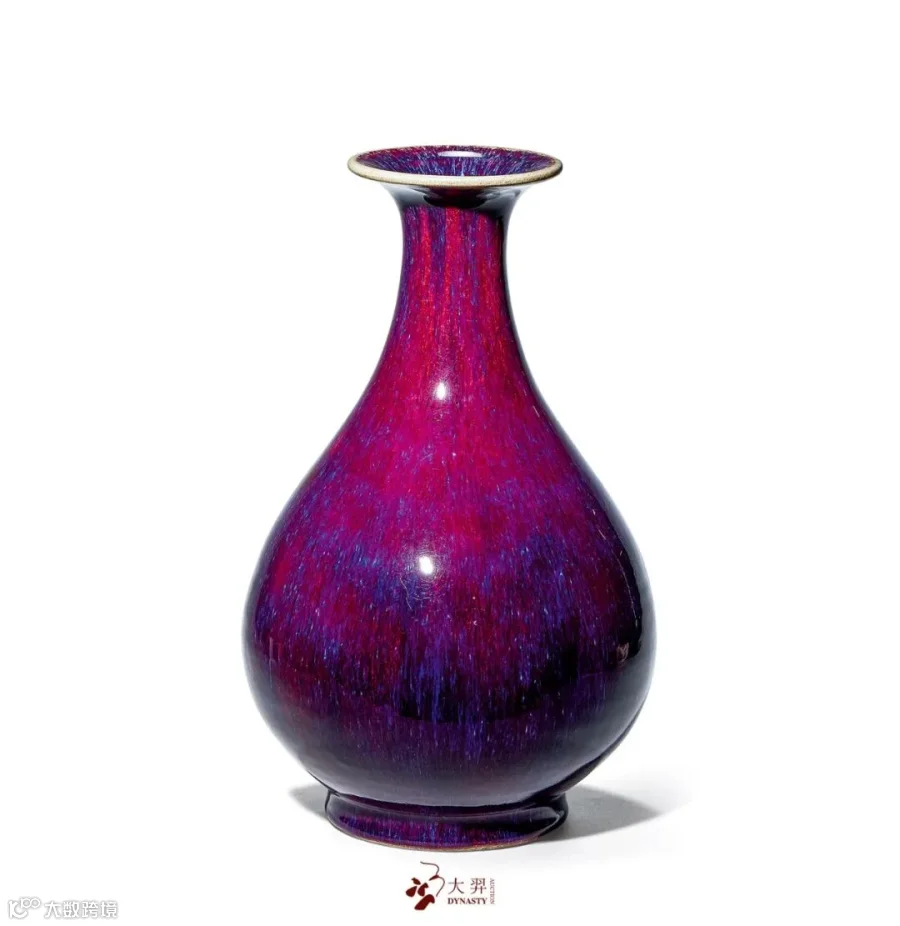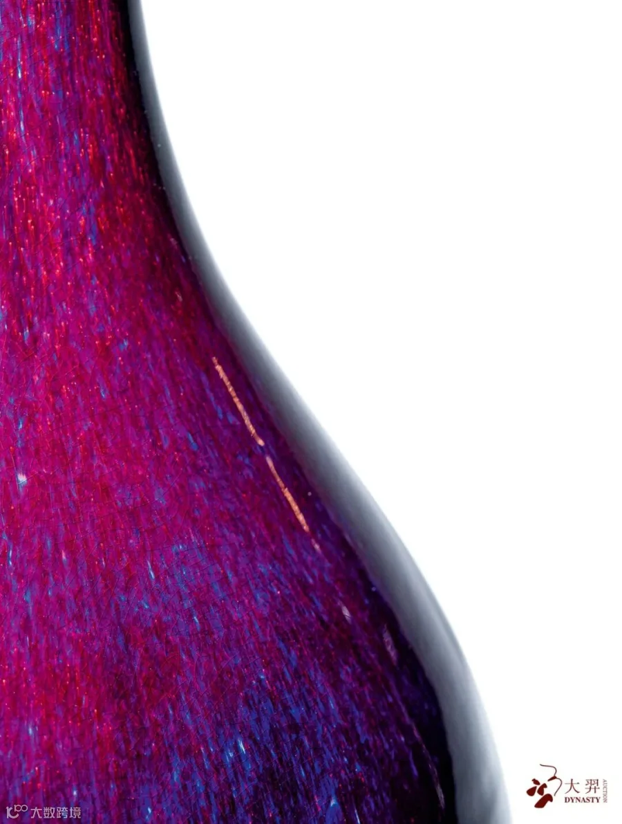 玉壶春之得名最开始或为一种美酒,而清高宗的御制诗有言“古瓶盛酒后簪花,花酒由来本一家”可巧妙的点明玉壶春之由来。本品造型雅致端庄,撇口、束颈、垂腹、下承圈足。通体罩施窑变釉,色泽圆融交汇,瑰丽明妍,除天然釉色外别无繁饰,展现纯粹釉色之美。其釉丰腴俏艳,明朗润泽,虽然人工,却道法自然,釉彩水乳交融,变幻莫测,以此配花,可谓相得益彰。