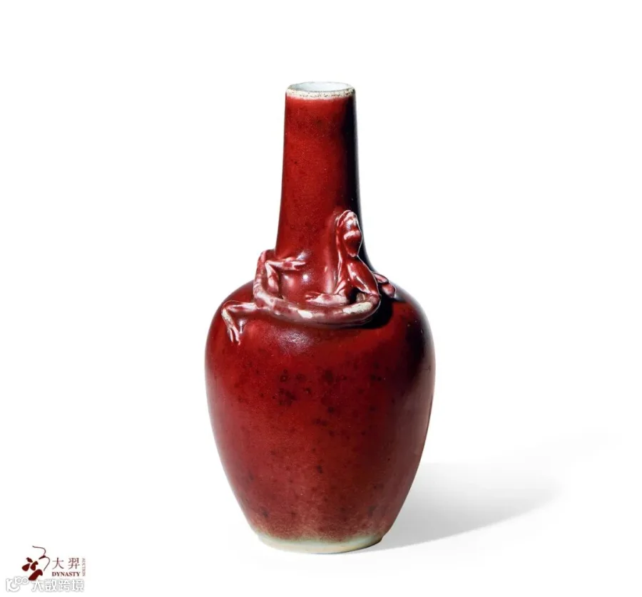 拍品圆口,细长颈,圆肩,长腹至下渐收,颈肩部堆塑蟠龙环绕,圈足。器身釉色柔和而富于变化,釉质莹润。豇豆红是清代颜色釉中的大名品,是康熙晚期景德镇新创的一种红釉品种,又有美人醉、桃花片、娃娃脸等名称。豇豆红不同于其他清三代单色釉瓷器的地方在于,它的红色可谓千变万化,如《饮流斋说瓷》中称“美人霁佳处在于淡红中显鲜红色与茶褐色之点,背光则显绿色”,正如豇豆红釉赞誉诗所述一般:“绿如春水初生日,红似朝霞欲上时”。