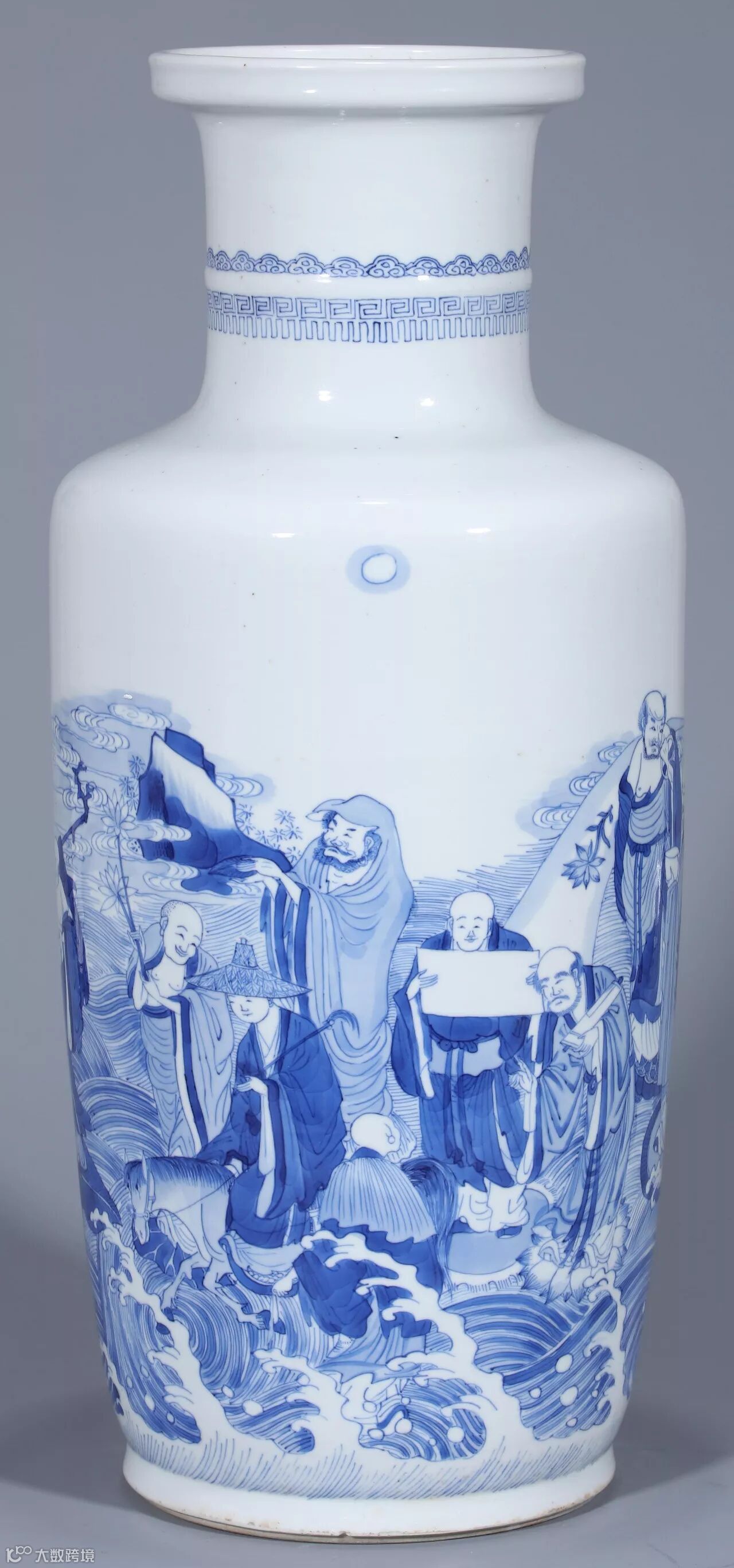 渡海为中国神仙故事中的传统题材,古人出于对海的敬畏,认为渡海方能显其神通。以历史人物与戏曲、小说故事为题材的画面自金代出现后,曾出现了三个高峰时期,分别为元代、明晚期、康熙时期。其中尤以康熙时期的画面题材最为丰富,如三国演义、水浒传、封神榜、西厢记等。而此题材十分于棒槌瓶中十分罕见,故弥足珍贵。