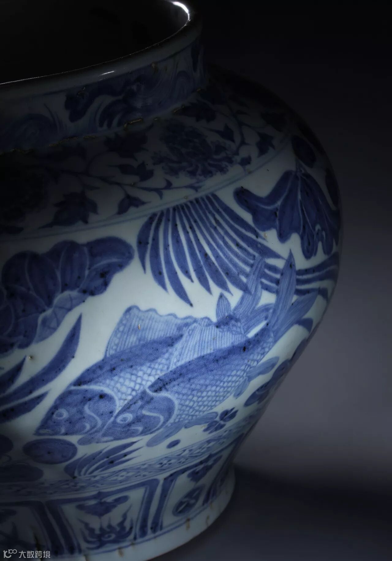 腹部以四组清新流畅的水草将主题纹饰大致分为四部分,每一部分分别描绘鲭、鲌、鲤、鳜四种鱼,取其谐音,寓意“清白礼贵”,背景点缀荷叶、莲花、浮萍。