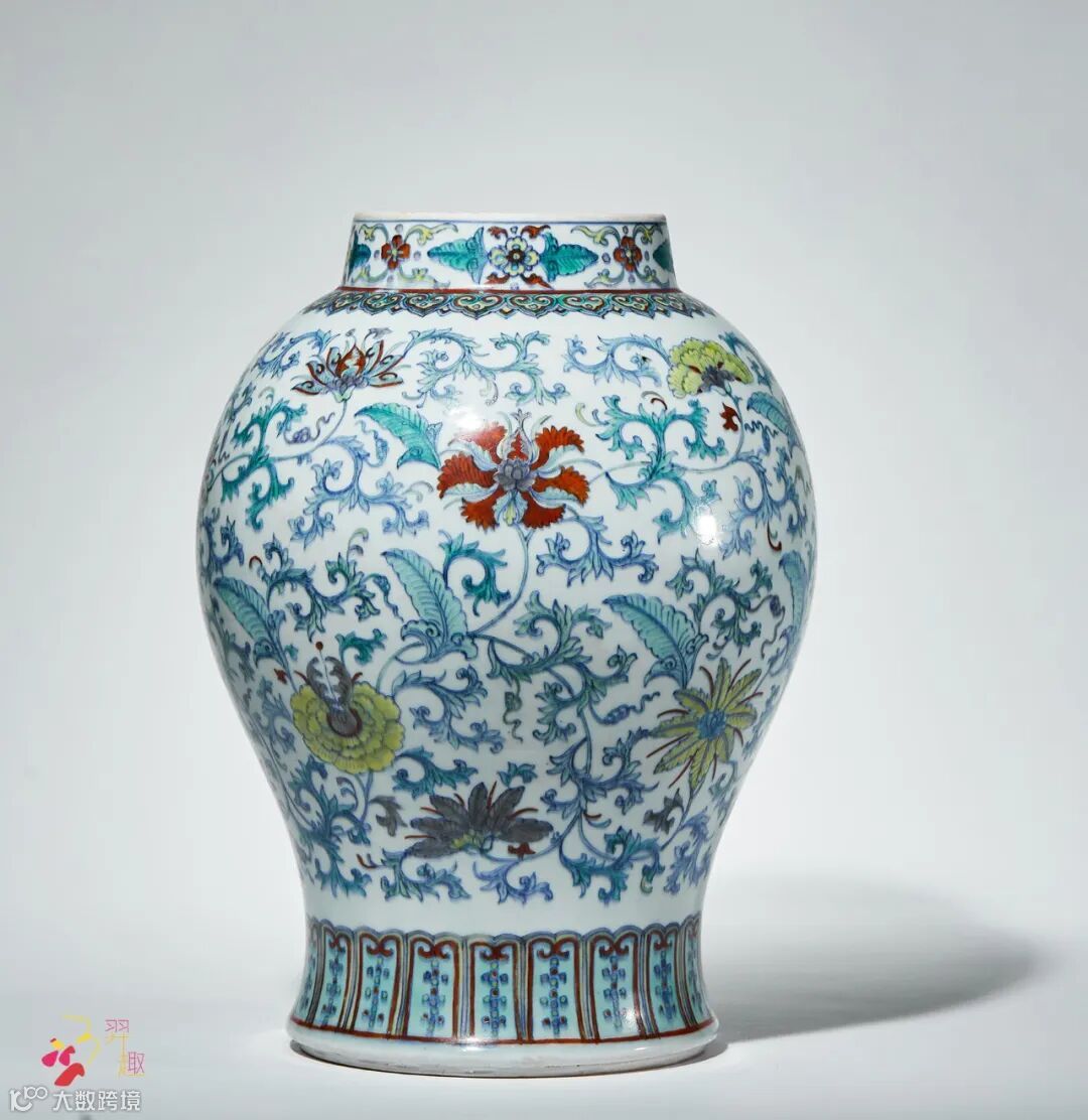 拍品圆口,短颈,鼓肩,腹下收束,圈足。通体以斗彩为饰,器身主题图案为缠枝花卉纹。装饰以红黄绿彩主色,青花为辅,明丽悦目。图画满密繁复,富丽堂皇,构图精巧,色泽艳丽,重迭交错。