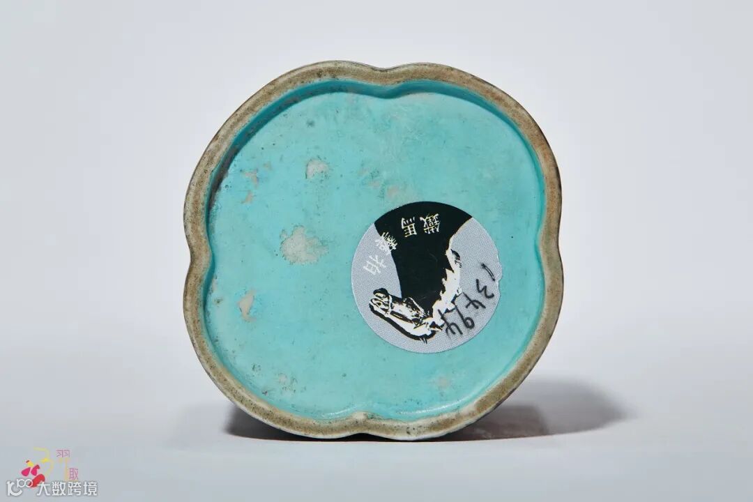 LOT329 十八世纪 粉彩仿槟榔石纹开光婴戏图海棠形笔筒(底部图)