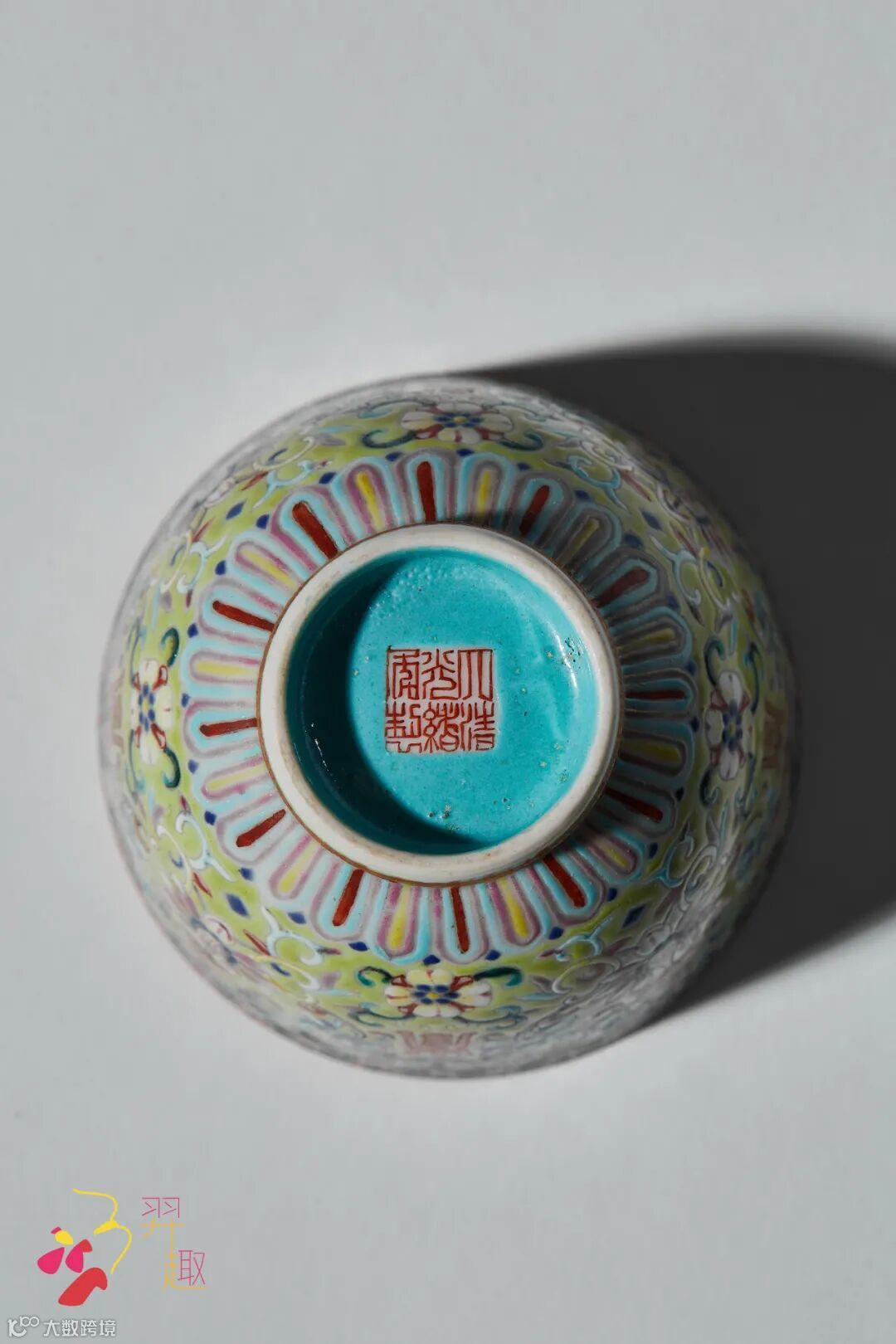 拍品珍罕之处在于落极为少见的光绪篆书款,这是宫廷顶级粉彩瓷的作派。据《清宫瓷器档案全集》记载,这种杯是为慈禧太后寿辰订烧的。此杯型也极为标准,从乾隆延续到光绪,杯型完全相同的品种还有:万花锦杯,八宝纹杯,过枝癞瓜杯等等,均是顶级御用瓷。光绪矾红篆书款极为少见,但清宫旧藏的御题诗盖碗便是这种款识。
