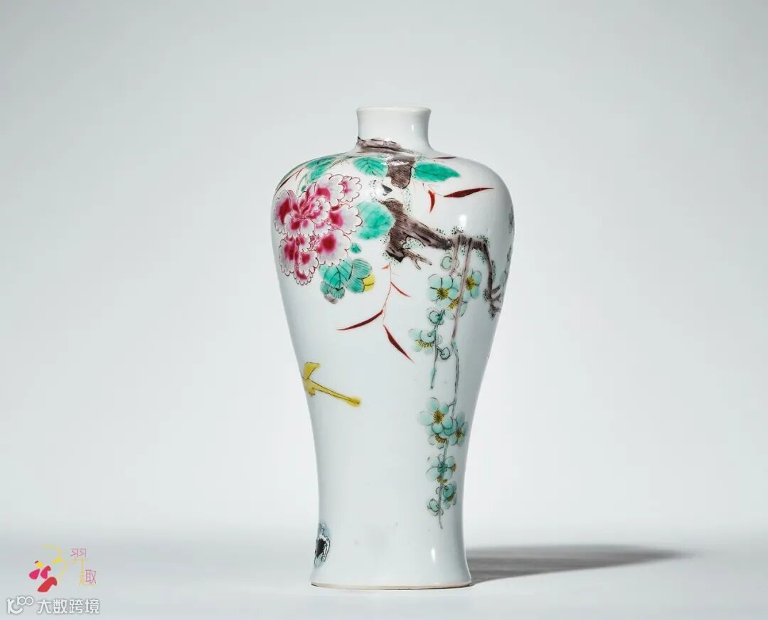 拍品唇口,短颈,丰肩,圆腹至足渐敛,圈足微外撇,造型端庄,胎体坚致细腻,内外皆施白釉。外腹绘粉彩花鸟纹,意为花开富贵,呈现了一派春意盎然,充满生机的画面。全器立意高雅,色调清新,置之书房,可赏可玩。