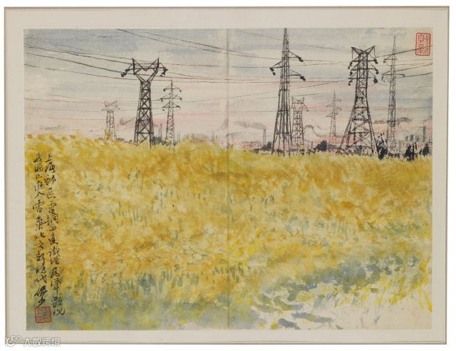 上海郊区电网四达,铁塔高耸,显现我国已进入电气化之新时代。俨少。 钤印:陆俨少印(白)、就新(朱)