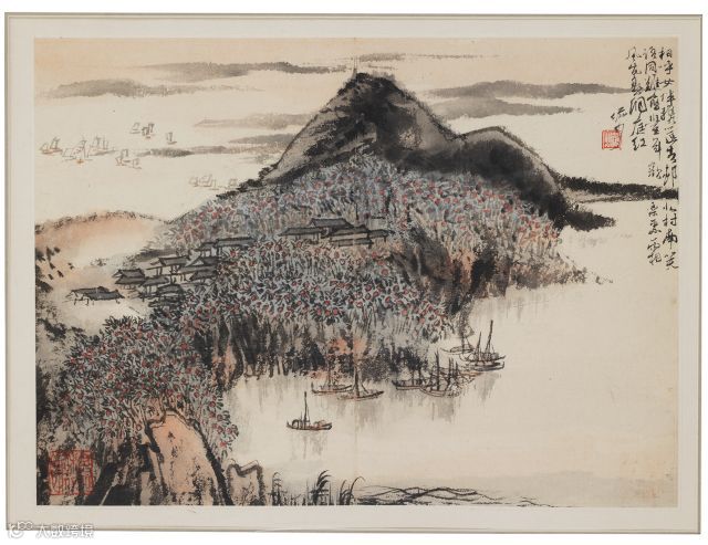 画家采用小写意的笔法描绘出洞庭湖畔的丰收景象,