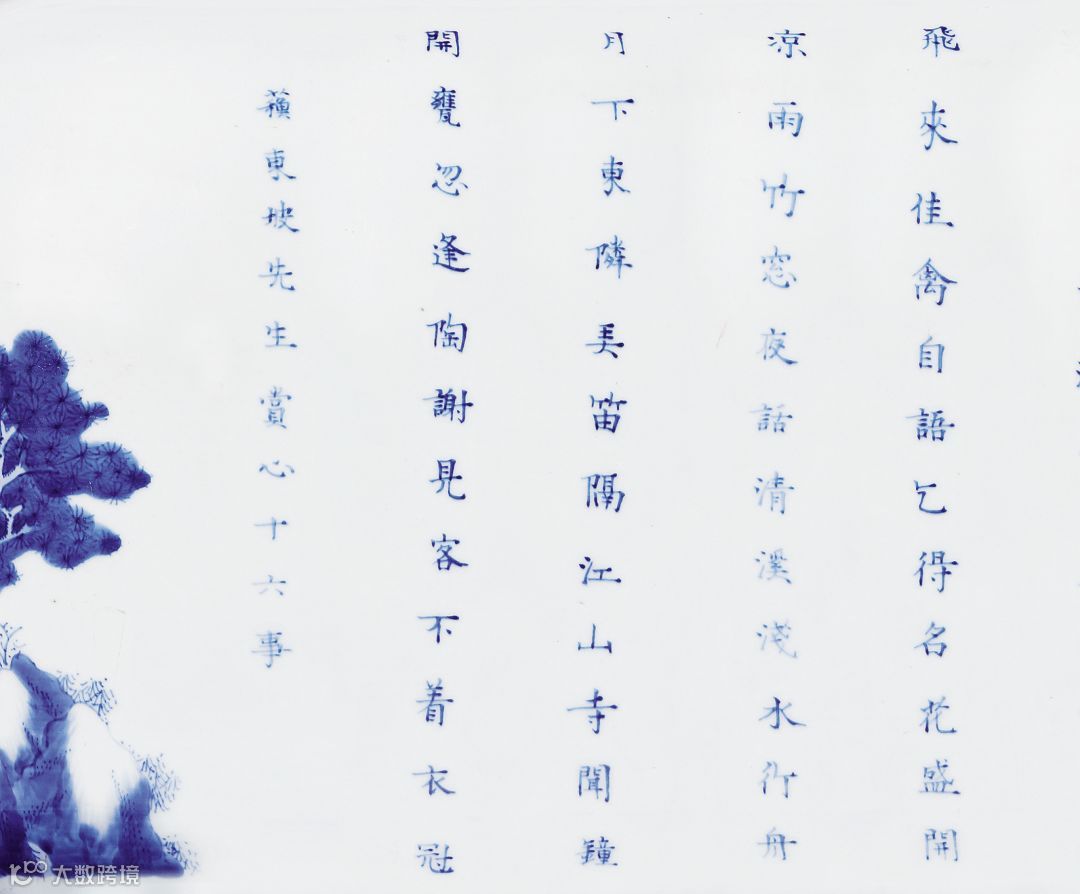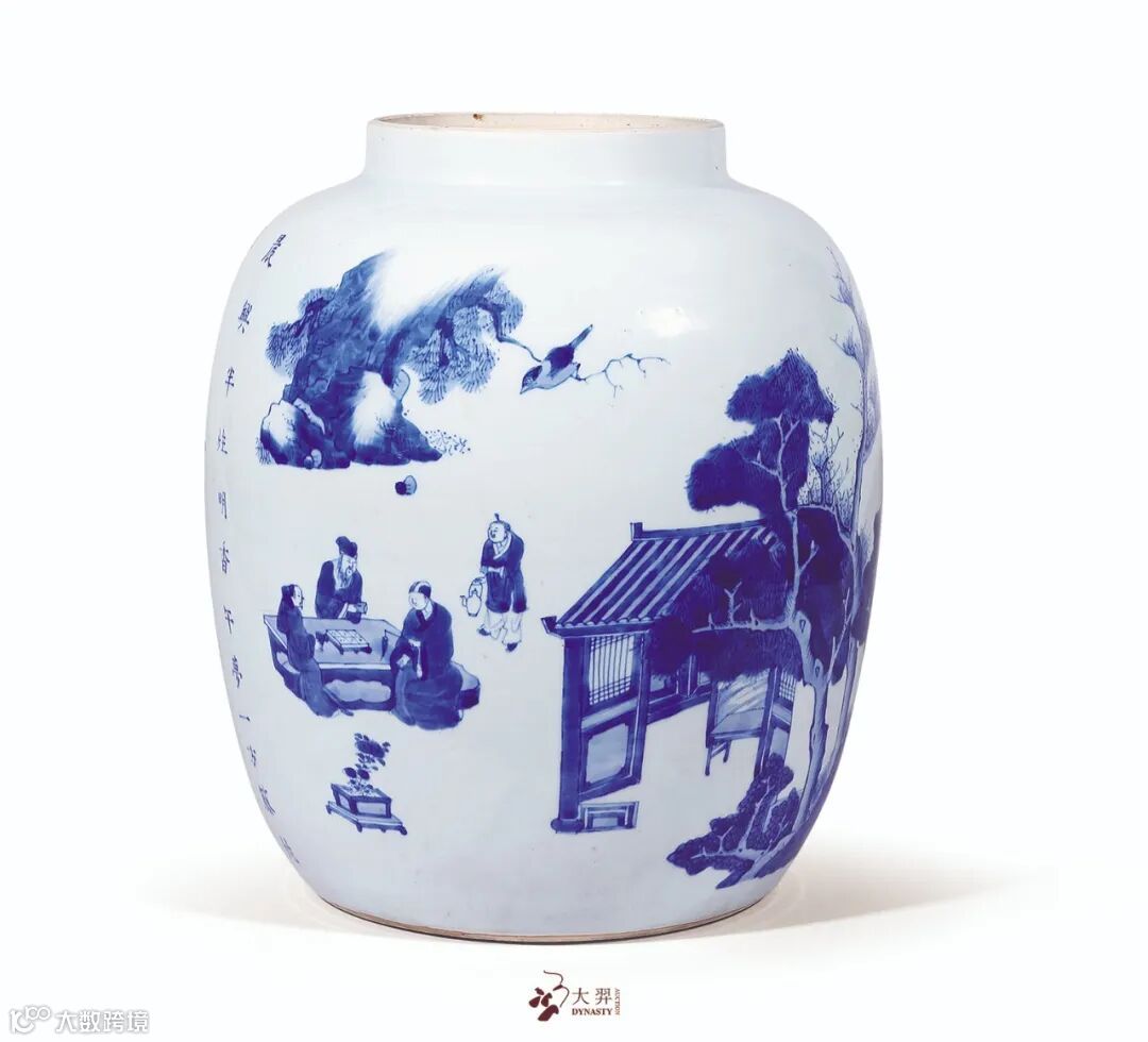罐短颈丰肩,鼓腹至下渐收。通体罩施白釉,釉质白中闪青,足端露胎处可见胎体细腻坚实。通体以青花为饰,一面绘山石嶙峋,老松横斜,其下屋舍半掩,旁侧隐士坐于石台之上品茗对弈,所绘纹样富有山林野景的别致趣味,构图疏朗得当,皴法娴熟,隐逸之情别具。另一侧则以大段诗文为饰“晨兴半炷明香,午梦一方藤枕;琹罢倚松玩鹤,客至汲水烹茗,花坞樽前微笑,柳荫堤畔闲行,暑至临流濯足,雨后登楼看山。飞来佳禽自语,乞得名花盛开。凉雨竹窗夜话,清溪浅水行舟,月下东邻弄笛,隔江山寺闻钟,开瓮忽逢陶谢,见客不着衣冠。”所书诗文为苏轼《赏心十六事》,但作者略有改动,如开瓮忽逢陶谢,原文“忽”字则为“勿”字,作者豪放洒脱之情仅以一字之差,跃然而出。整器青花发色明快,浓淡相宜,层次清晰,诗赋图画相映成趣,题材不羁。