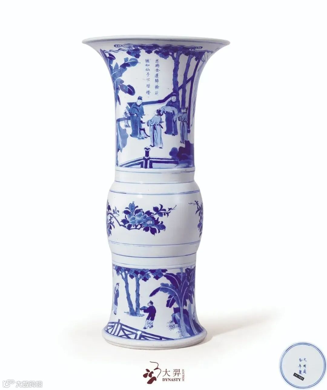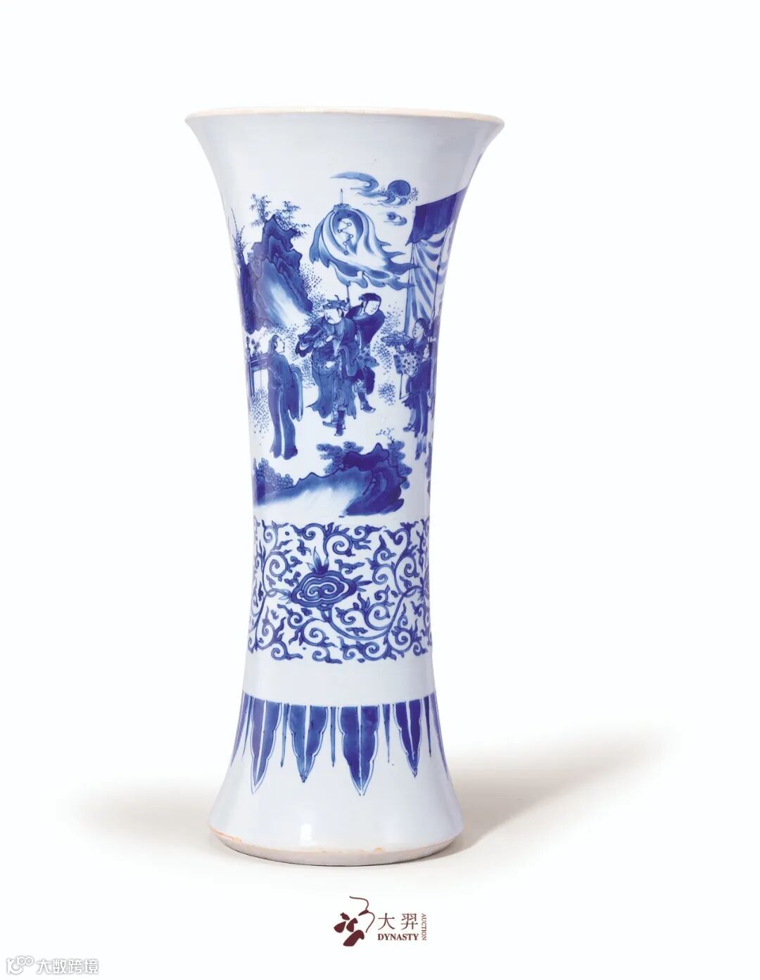 本品敞口,器身修长,至底外侈,口底相若,造型颇为别致。通体罩施白釉,其上以青花绘饰辞行图。画面中人物神态各异,高超娴熟的绘画技巧将人物形象表现的栩栩如生,其面部表情,身姿动态,乃至衣褶折迭错落之处尤见功力。明万曆末年,官窑难以维继,此一时期涌现了颇富文人意趣的民窑上品细料瓷,与官窑呆板且程序化的表现方式不同,此类纹样大多取自时下流行的文学或戏曲典故,构图方式也与印刷版画及中国画风格交融,如地上“V”形草纹,半空中平行括号状的浮云,以及被浮云拱卫的太阳,皴染画法的山石,山石旁的椿叶点,如此诸多特点俱是崇祯一朝典型标准器之要素,而晚明画意的转变,下启康熙瓷画流行戏剧故事人物之先声,开一代未有之潮流。