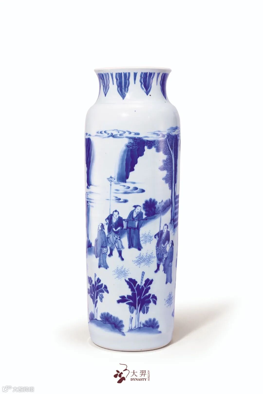 拍品撇口,束颈,筒状腹。瓶身以青花绘文王访贤图,通景绘文王访贤故事图,画中老者作揖恭受访贤,各自身后均有仆从,神态各得。所绘岩石,颇具质感,青花发色鲜妍夺目,分水技法细腻。高超娴熟的绘画技巧将人物形象刻画得栩栩如生,衣褶折迭错落之处尤见功力。晚明画意转变,下启康熙瓷画流行戏剧故事人物之先声,开一代未有之潮流,由此可见证一二。