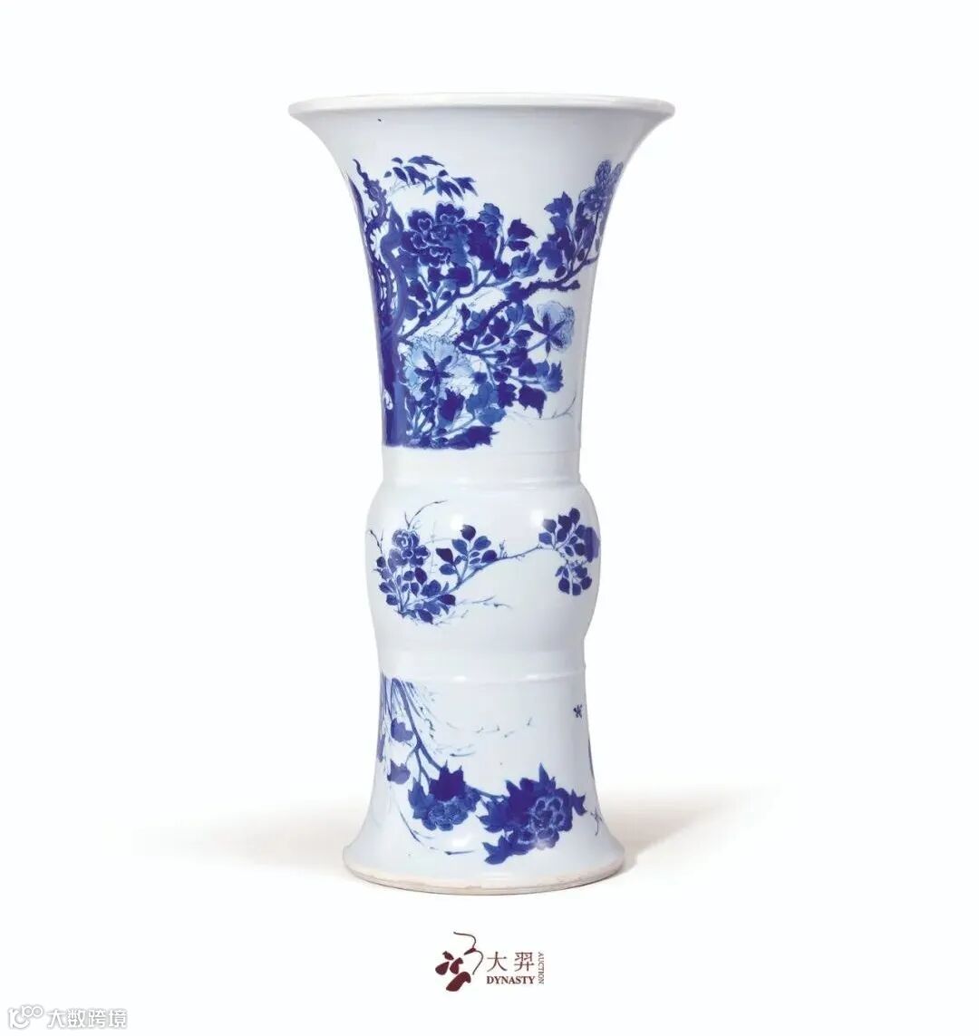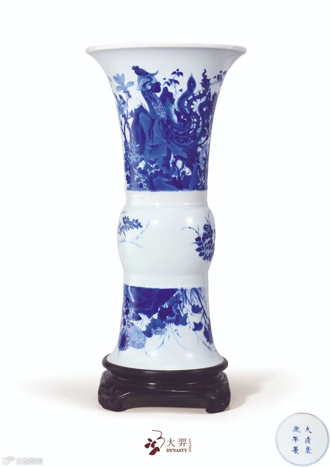 本品撇口长颈,鼓腹,底足外撇,双层台圈足,造型隽秀挺拔,为标准康熙花觚制式,因其外壁平缓甚适展示瓷画之美,故广为流行,所画题材丰富繁多,令人叹为观止。本品通身以青花为饰,纹样分层而饰又互相呼应,颈部为丹凤牡丹纹,洞石嶙峋,凤凰引吭于其上,身侧牡丹玉兰争相怒放,更有玉堂富贵之吉意。腰部及胫部也以各式折枝牡丹花卉为饰,整器青花之色妍丽秀雅,分水技法炉火纯青,当为康窑青花“蓝分五色”之典型,配以精良细腻之胎釉相映衬,悦目而赏心。