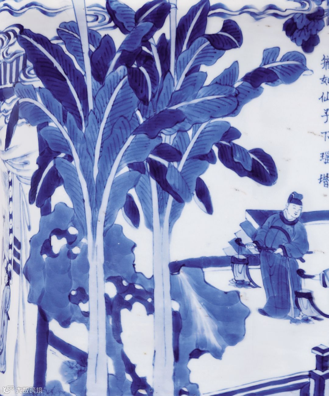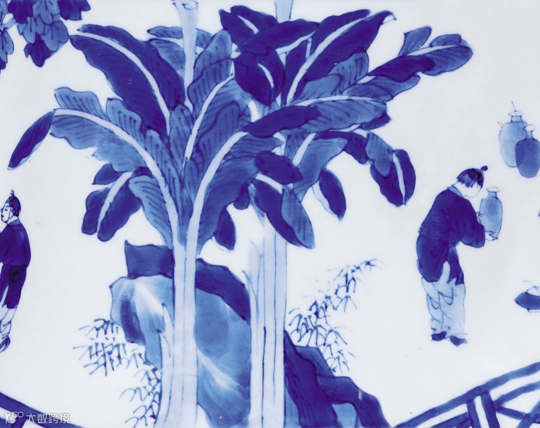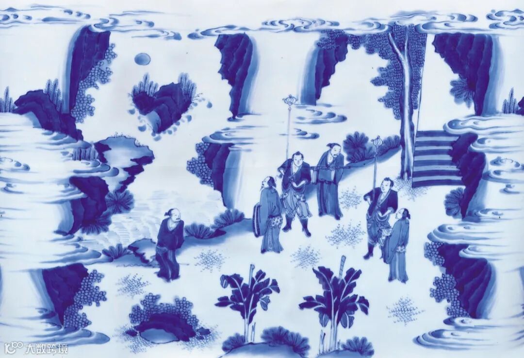访贤图这一画片出现的缘故可能与晚明政治状况密切相关。崇祯皇帝即位后诛除魏忠贤等奸党,平反冤案,起用前朝被罢免官员,广纳贤才,朝廷始有清明之象。此时文人雅士当中出仕奉君之思潮暗涌,与隐逸自洁、寄怀山水的主流形成对立。此访贤图罐的出现颇有深意,正是此种思潮之寄托。此罐从画风上具有典型明末时期的风格,譬如地上的V形草纹,山石边的鱼卵状叶片,中茎留白的蕉叶纹,介字点叶片,皴染画法的山石,如此诸多特点俱是典型标准器之要素。