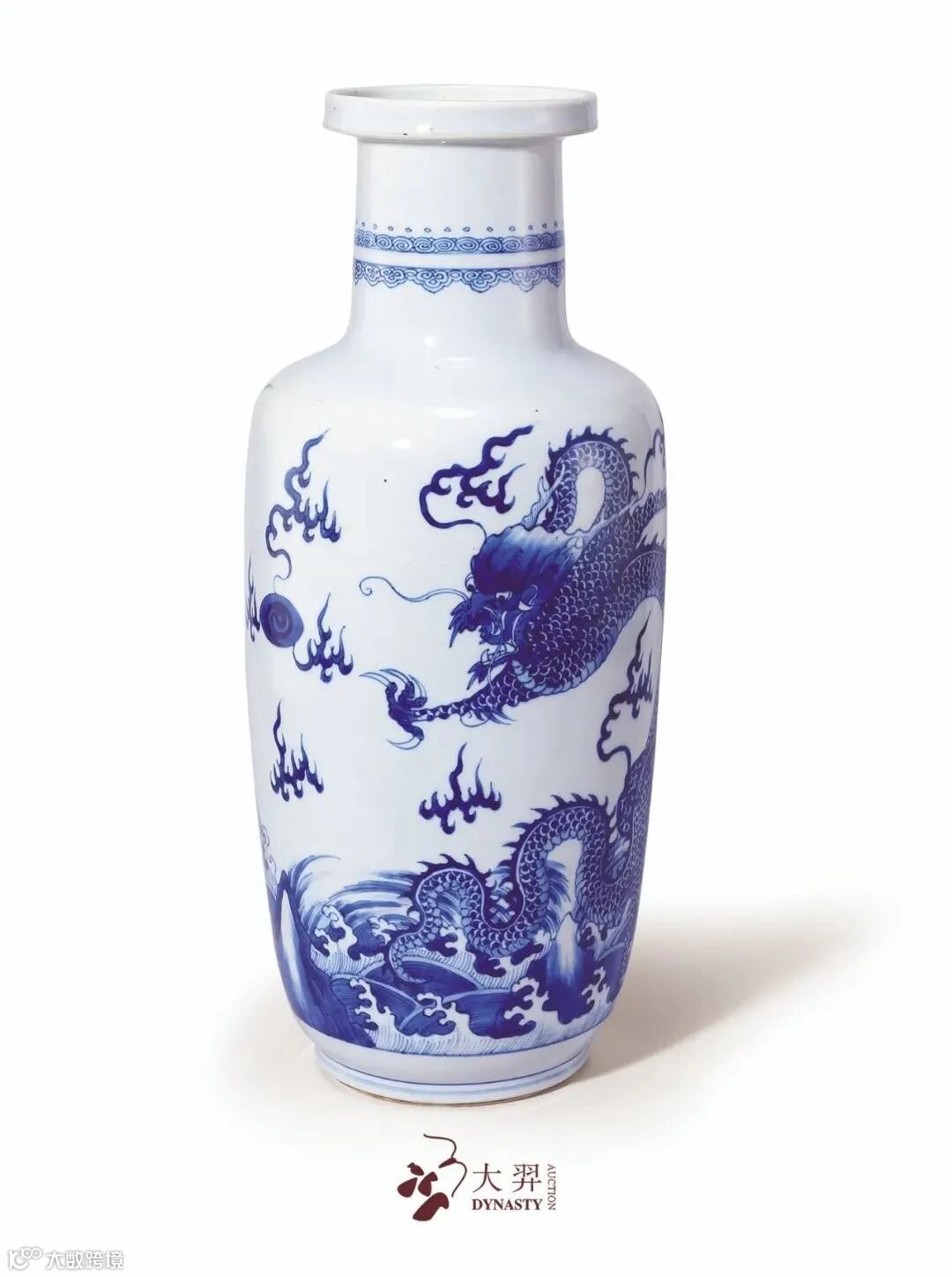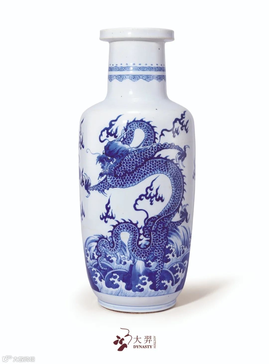 拍品盘口直颈,折肩长腹,下出圈足,器型沉稳雄浑,其势恢弘挺拔。通体施白釉为地,瓷胎精良坚实,釉色润泽清透,颈部弦纹一周,起线流畅,上下青花绘以点珠回纹及如意云头纹。腹壁通体以青花绘双龙赶珠纹样,蛟龙腾跃而立,威猛矫健,气势磅礴,鬃发上扬,龙鳞片片,怒目炯炯,追赶火珠,展现出典型的康熙龙纹绘画风格。其下胫部绘以江崖海水纹样,海浪翻腾汹涌,以晕染及线条穿插,层次之感鲜明强烈,画工高妙,技艺超群。整器造型规整庄重,体量硕大,尚无变形,甚为罕见,于市场上流通不多,青花发色妍丽明艳,用料精湛上乘,烧造技艺炉火纯青,极具时代风格意趣,当为一件不可多得的康熙陈设佳器,可堪珍贵难得。