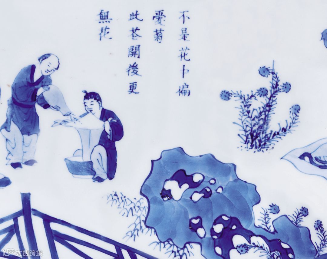 腹部饰四时折枝花卉纹样;胫部绘陶渊明饮酒赏菊场景。树下陶渊明举杯独饮,一童捧酒侍候,一仆采菊荷归来,题材高雅,空白处题“不是花中偏爱菊,此花开后更无花”。画面人物形象刻画精细,姿态生动传神,青花色泽艳丽,浓淡变化自如,且以诗文表明主题画意,为少见的描绘人物故事的康熙朝青花瓷器精品。