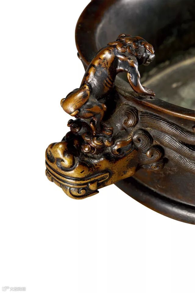 頭頂雙耳小巧,獨角後伸。鬣髪高浮雕,分腦後兩側,貼依爐壁,各有三縷,其上絲絲陰刻,分毫畢現。龍頭上各有獅子壹隻遙遙相望,探頭弓背,瘦骨嶙峋,團尾上揚,兩前肢扒爐口沿,兩後肢分立龍眉。兩獅高低錯落,雙目炯炯,兩耳低垂,團髪繞頸,肌肉爆起,威武有力,似將壹躍而起。爐底之下,有四獸足,上飾雙層卷雲紋,下有三爪猙獰鋒利,如破雲而現,從天而降。底款鑄“大明宣德年製”雙行六字楷書款,深峻清晰,秀美雋永。