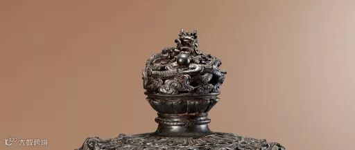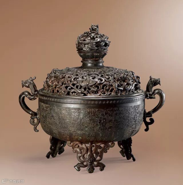 此熏爐體量龐大而不失精緻,紋飾細密,繁複華麗。爐身渾圓周正,方唇口,腹部似缽,兩側有雙龍耳,底承三花足。蓋部鏤空,蓋鈕厚實。蓋部裝飾為熏爐最大的亮點,鈕圓雕盤龍戲珠。龍眉宇威嚴,雙目圓突,翹鼻長鬚,鬣髪飄飄。身軀扭轉,踡曲壹團,長牙五爪,前置寶珠,火焰繚繞。龍身下方祥雲朵朵,處於仰覆蓮花臺上。蓋鈕壹周,作蓮瓣紋環繞,蓋部滿工纏枝寶相花紋穿插交錯,花朵正向,蓬勃綻放。纏枝紋上有螭龍兩條,披髪圍頸,獨角上翹,身軀蜿蜒,四隻奮力攀爬。紋飾圓雕,外加陰刻,將寶相花、草葉、螭龍刻畫的分毫畢現。其鏤空之處,用以焚燃溢出香,設計合理巧妙。這種熏爐蓋和鈕,可參見故宮博物院清宮舊藏明代獅耳銜環方蓋爐,兩者如出壹人之手