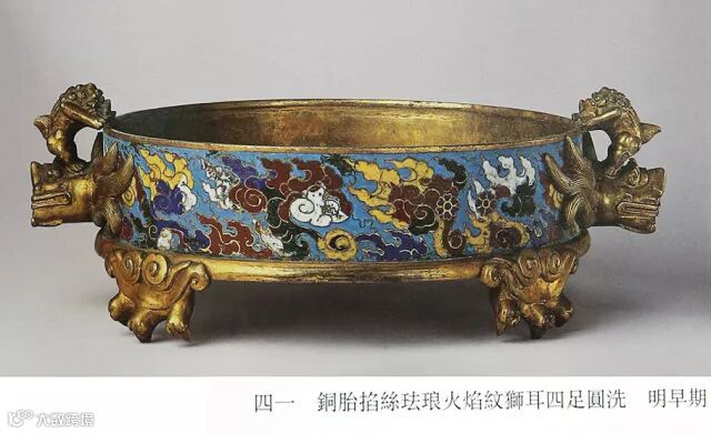 此件盆式爐造型別緻,傳世僅見,將龍、獅之形融匯合壹,成凝重莊嚴之器。器身近水仙盆,平面橢圓,口沿外侈,腹部略深,底部平,周圍起厚唇邊。雙耳為畫龍點睛之筆,由器身出龍頭兩隻,圓雕鑄造,眉弓高凸,眉毛三盤卷,兩目上望,前吻突出。闊鼻大口,僚牙外露,鬍鬚虬曲,繞顎排布。
