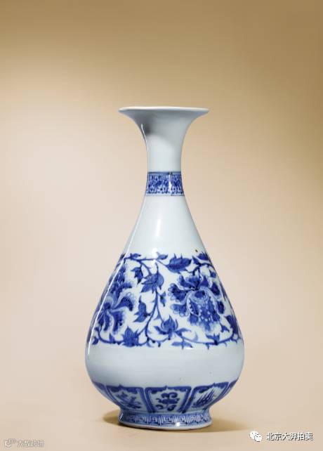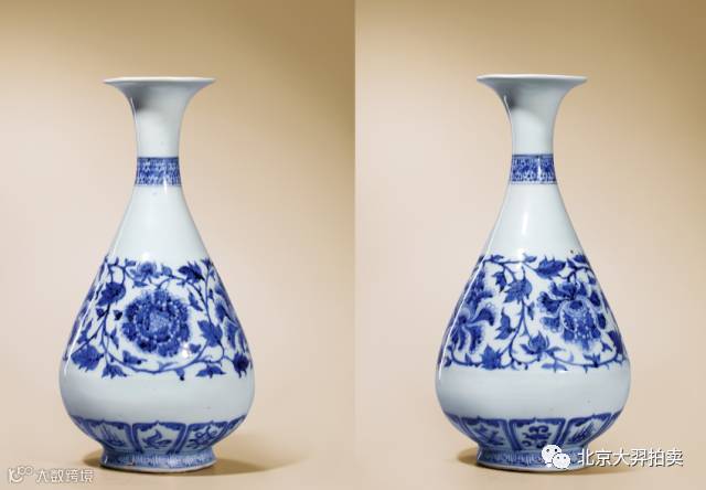 玉壺春瓶由宋人詩句中“玉壺先春”壹詞而得名,始見於宋代而壹直延燒至今。許之衡《飲流齋說瓷》記:“玉壺春口頗侈,項短腹大,足稍肥,亦雅制也”,元代景德鎮窯生產的玉壺春形制,相較於明清樣式瓶頸細長,腹部較小,修長俊美,胎薄體輕。