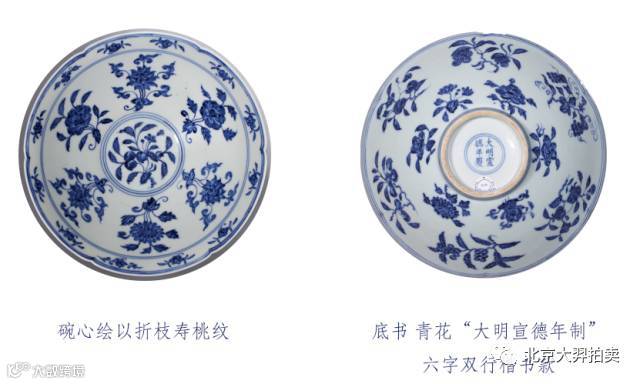 此碗花口,斜腹,呈鬥笠狀,圈足。外壁裝飾兩重紋樣,上為六組折枝瑞果紋,下為六組折枝花卉紋,交錯布置,內壁口沿綴飾十二式花果紋,下承六組折枝花卉紋與外壁紋飾相對應,碗心則繪以折枝壽桃紋。底書青花“大明宣德年制”六字雙行楷書款。