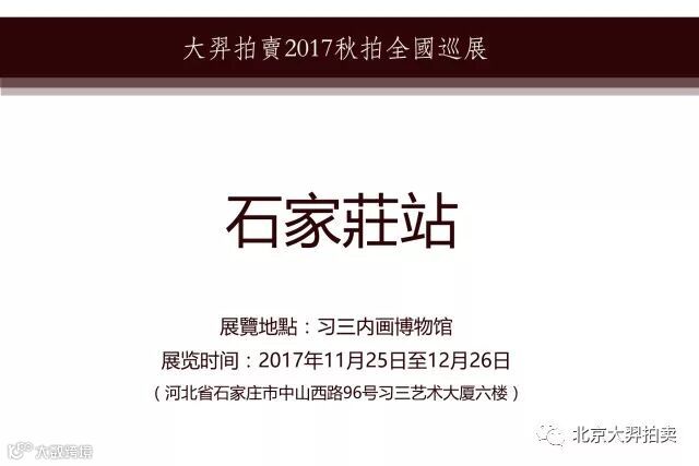 由北京大羿拍賣有限公司舉辦的2017秋季拍賣全國巡展活動于11月10日在廈門正式啟動,今日于杭州凯悦酒店大宴会厅Ⅲ進行展覽,隨後将于11月25日在石家莊习三內画博物馆进行最后一站巡展。
